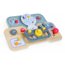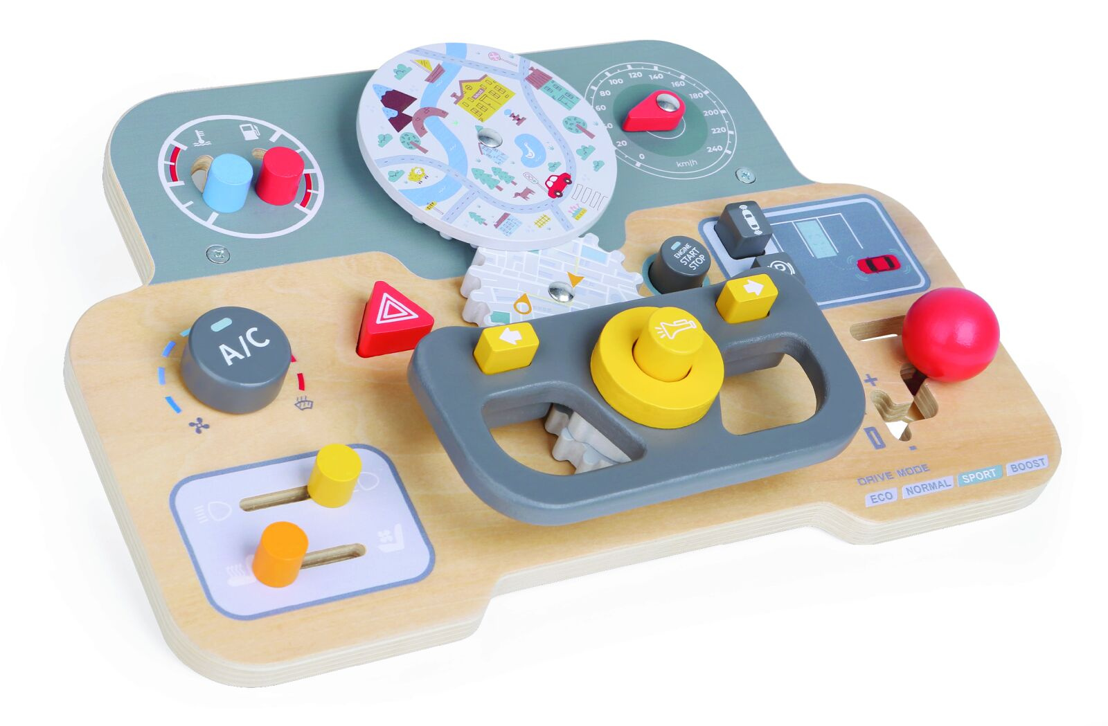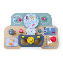 Mami, tati, dneska řídím já! Tato hrací deska přináší spoustu zábavy, díky které bude moci Vaše dítě rozvíjet svou zručnost, zvídavost a zejména jemnou motoriku. Interaktivní prvky jako jsou tlačítka či otočná kolečka dávají dítěti možnost procvičovat různé posouvání, otáčení či cvakání a připravit se tak na každodenní úkony. Mimo aktivit zapojující smyslové dovednosti deska disponuje volantem - skvělá možnost jak posunout představivou hru ještě dál. A navíc si mohou i zatroubit na cestu. Jízda to bude daleká!