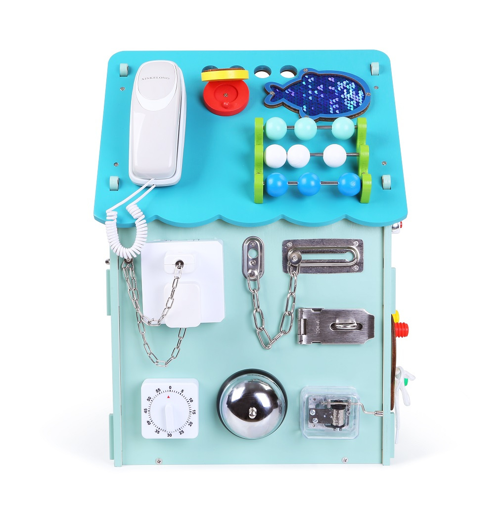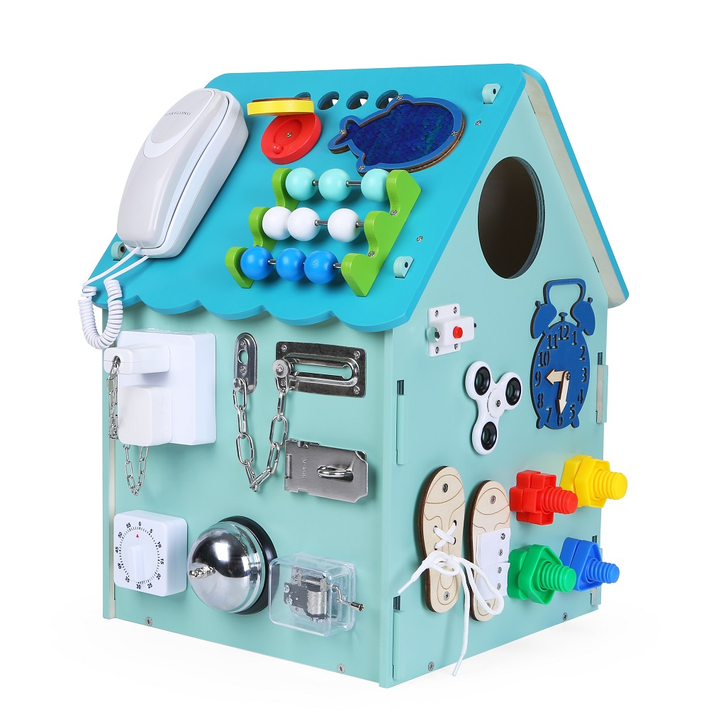 Od zvonku až k telefonu! Tento domeček přináší spoustu zábavy, díky které bude moci Vaše dítě rozvíjet svou zručnost, zvídavost a zejména jemnou motoriku. Zámky, pásky a tkaničky dávají dítěti možnost procvičovat různé vázaní, spojování, otáčení či otevírání a připravit se tak zábavným způsobem na každodenní úkony. Mimo aktivit zapojující smyslové dovednosti deska disponuje i edukativními prvky jako je počítadlo nebo hodiny. Domeček se dodává složený v krabici.