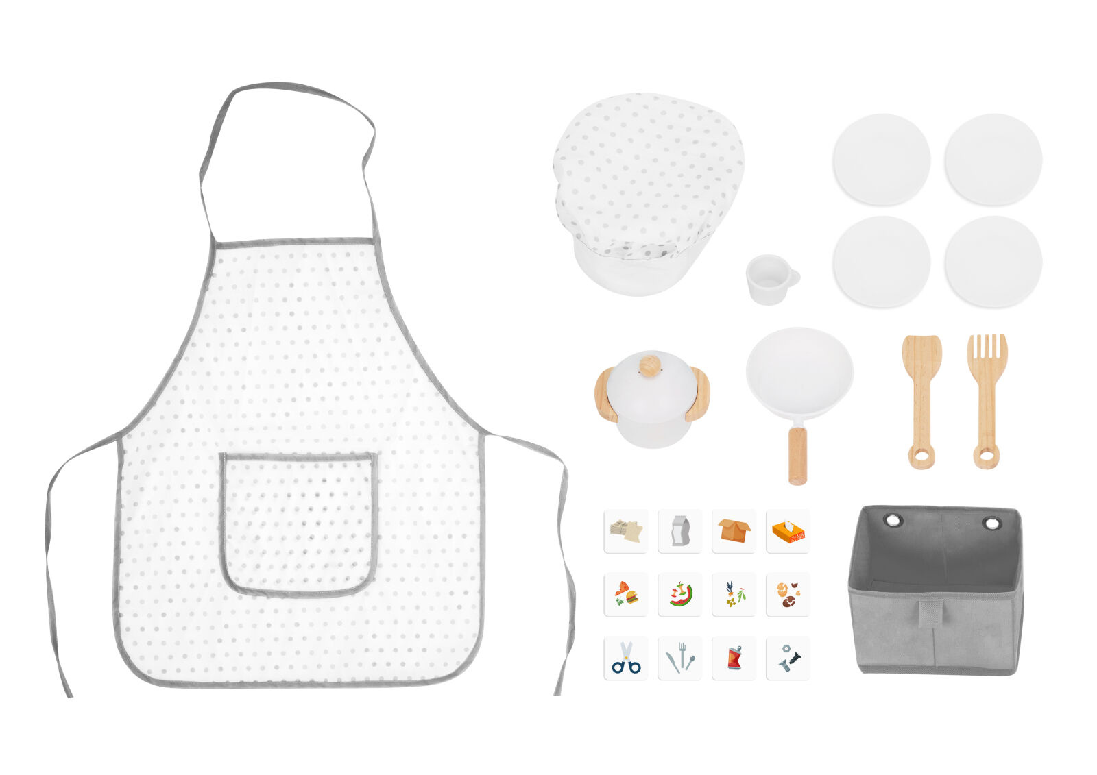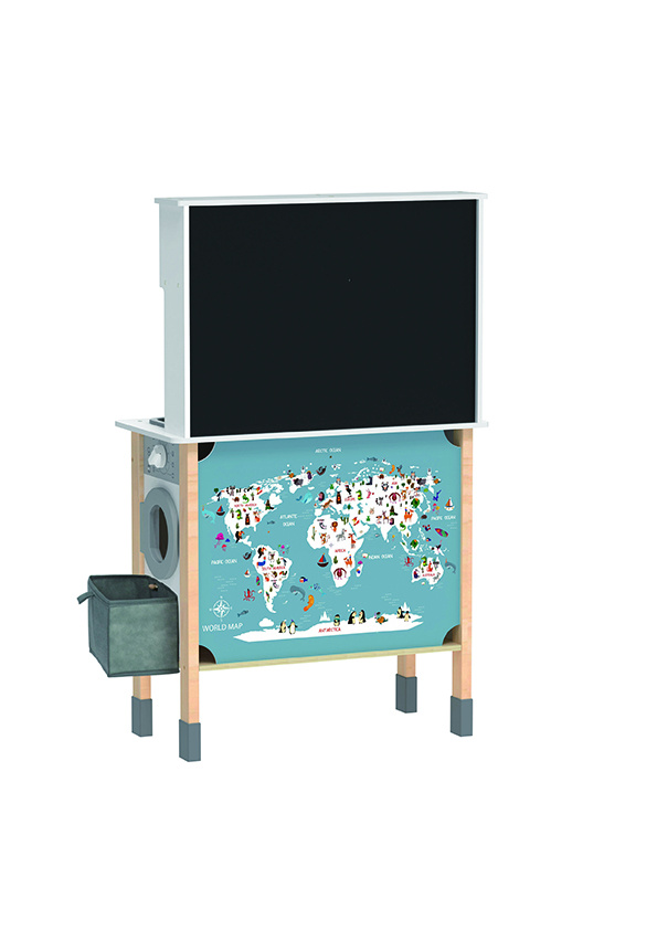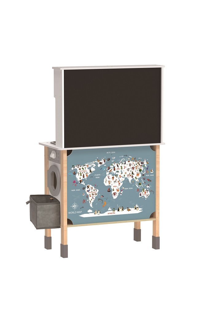 Je libo čerstvý koláček přímo z pece? Nebo snad máte zálusk na něco smaženého? S touto kuchyňkou můžete mít menu, jaké se Vám zlíbí. Je totiž plně vybavená! Najdete zde vše, co v žádné moderní kuchyni nesmí chybět - sporák s troubou, myčku, mikrovlnku, dřez, kávovar a samozřejmě nádobí s náčiním, jako jsou talíře, hrnec, pánev, hrneček a další. Na boční straně kuchyňky je umístěna pračka, ze které je možné vyprané prádlo uložit do zavěšeného odnímatelného košíku. Ani zadní strana kuchyňky nezůstala nevyužitá. Na praktickou černou tabuli mohou děti napsat vzkaz, sepsat suroviny receptů nebo něco nakreslit. Jako inspirace jim třeba poslouží zábavné mapa se zvířátky, která je také zezadu. Tak si nasaďte kuchařskou čepici, oblečte praktickou zástěru a můžete začít vařit. Jelikož nám záleží na planetě Zemi, nesmíme také zapomenout na koše na třídění!