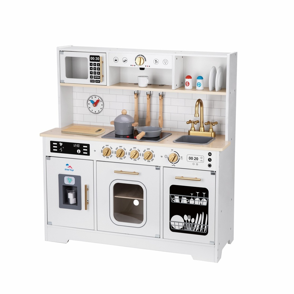 Tato velká dětská kuchyňka je ideální hračkou pro všechny malé kuchaře a kuchařky, kteří milují vaření a chtějí objevovat svět kulinářských dobrodružství. Moderní design v elegantní kombinaci šedé barvy a zlatých doplňků doplňují realistické spotřebiče a bohaté příslušenství, které dětem umožní rozvíjet kreativitu, samostatnost a hru na role.