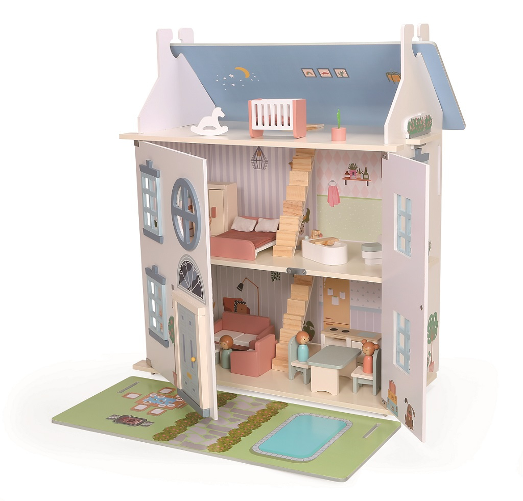Vítejte v domečku! Na místě, kde příběhy čekají jen na Vás. Díky třem patrům a bohatě prostorným pokojům je pro Vaše malé panenky naprosto ideální. Spolu s rodinkou zde najdete vše, co je u moderní domácnosti zapotřebí – kuchyň, koupelnu, ložnici, obývák i dětský pokoj v podkroví. Sundejte přední část střechy, otočte jí a položte před otevřený domeček a hned máte pro panenky i zahradu s bazénem a nábytkem. Tvořte si rodinné příběhy dle vlastní fantazie! Při hraní děti procvičují komunikační dovednosti, prohlubují sociální interakce a využívají kreativitu
