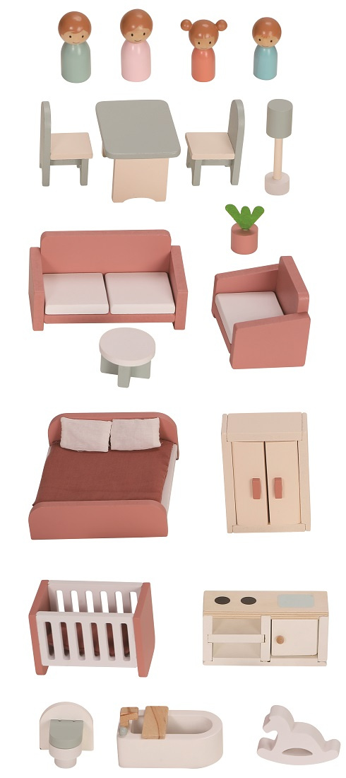 Rozměry domečku: 54x34,5x66 cm Rozměry balení: 66,7x59,7x6,5 cm Věk: 3+ Materiál: dřevo, plsť, látka Počet dílů: 25 ks
