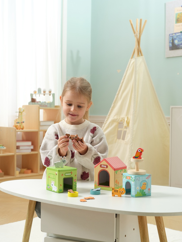 Užijte si spoustu zábavy se svými dřevěnými mazlíčky! Pes, kočka i králíček mají každý svůj domeček i jídlo a z bidýlka na ně dohlíží papoušek. Při hraní si dětí procvičují jemnou motoriku, sociální dovednosti a koordinaci ruka-oko. Tato hravá barevná sada podněcuje k nápadité hře. Dává dětem možnost se naučit, jak zvířátka žijí a jak se o ně správně postarat. Vyrobeno ze dřeva s certikací FSC.