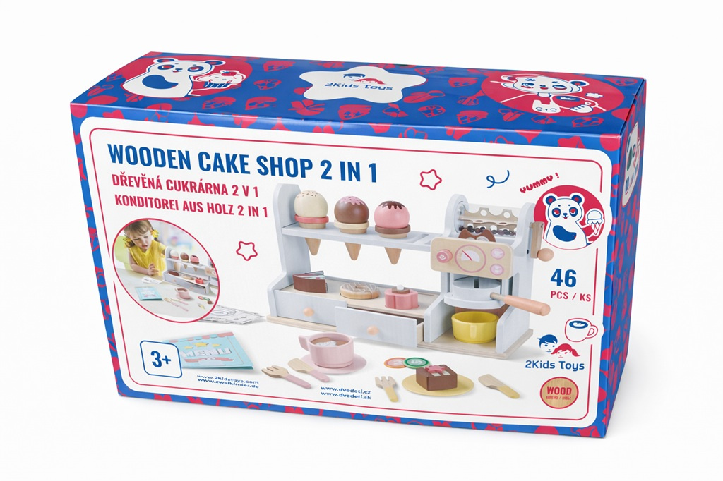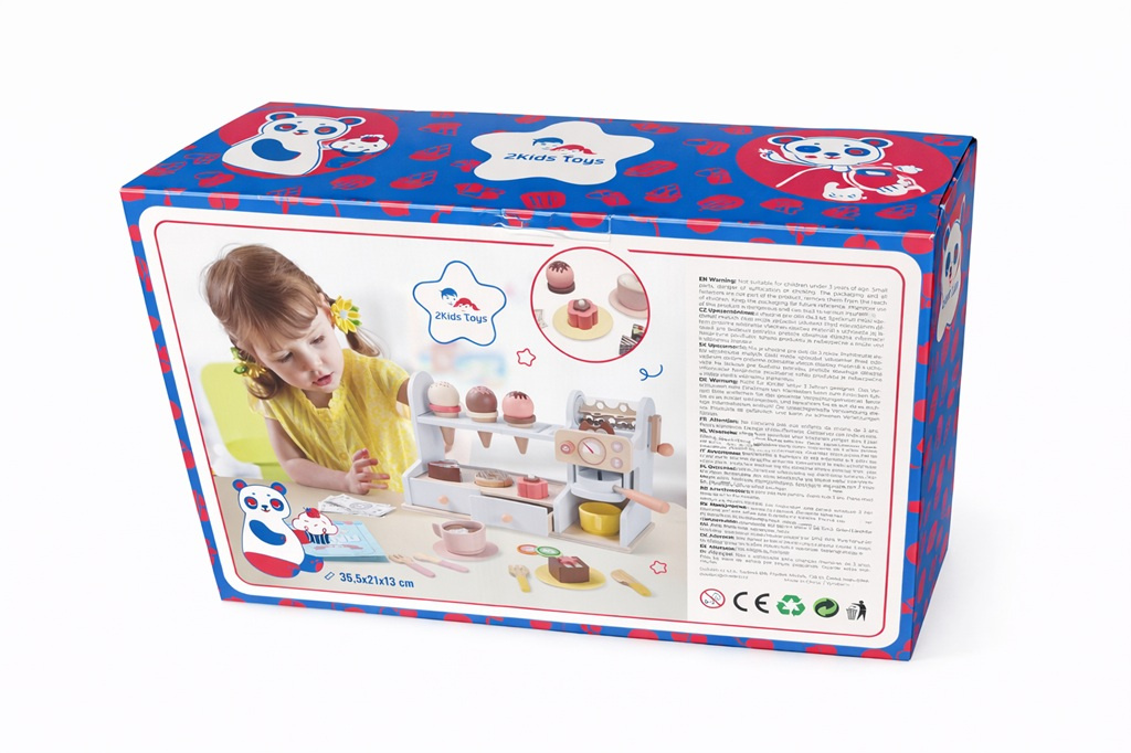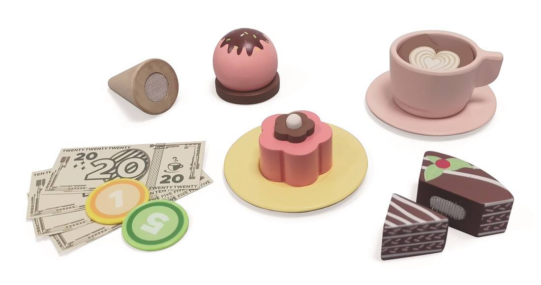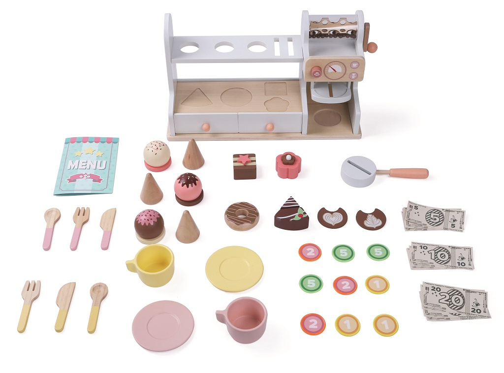 Staň se opravdovým baristou či obchodníkem! Je libo zmrzlinu, dortík nebo jen lahodnou kávu? S touto 46dílnou sadou si užijete hodiny zábavy. Sada nabízí šálky s podšálky, příbory a lžíce, pultík s kávovarem, vitrínou s dortíky a poličkou s díry na zmrzliny. Nechybí ani zásuvky s úložným prostorem pro peníze, které jsou také součástí této sady. Hračky na hraní rolí popouštějí v dětech fantazii a inspirují ke kreativní hře, což má příznivý dopad i na jejich slovní zásobu a rozvoj jazyka.