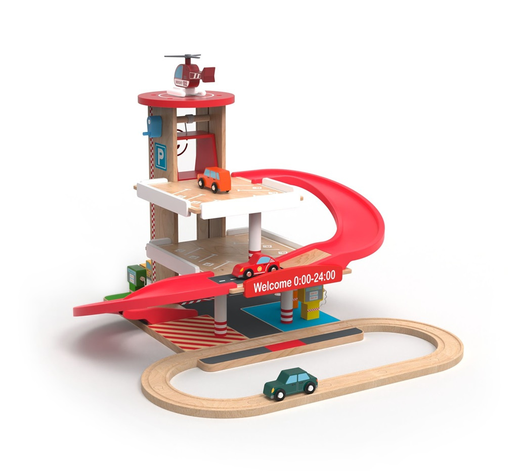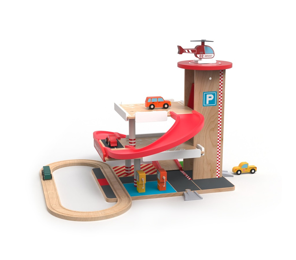 Všem automobilovým nadšencům se rozzáří oči, až uvidí barevnou garáž s výtahem a heliportem. Natankujte ekologicky u stojanu v přízemí. Vyvezte svůj vůz pomocí výtahu s klikovým pohonem a sledujte, jak sviští po rampě dolů a pokračuje dál po dráze. Stala se nehoda? Z heliportu na střeše už startuje helikoptéra. Tato edukativní hračka motivuje děti ke kreativní a představivé hře. Rozvíjí koordinaci ruka-oko, jemnou motoriku a zručnost. Garáž s parkovacími plochami na třech úrovních obsahuje také 4 autíčka a helikoptéru.