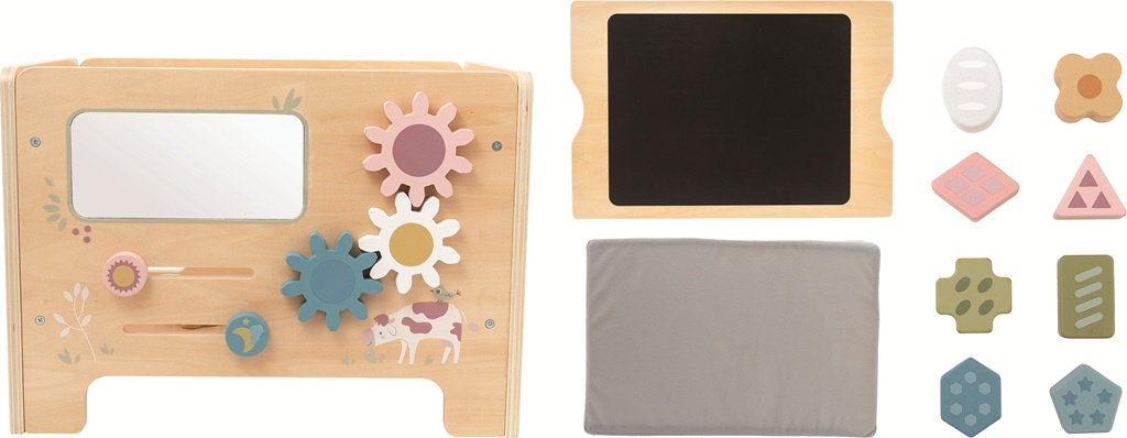 Labyrint se zvířátky, vkládací tvary, ozubená kolečka, hodiny, zrcátko… Tahle stolička je malá, ale neskutečně akční. A k tomu všemu laděná do přírodních a pastelových tónů, takže se stane i atraktivním doplňkem dětského pokoje či herny. Stolička je dodávána v nesloženém stavu. Nutná montáž dospělou osobou.