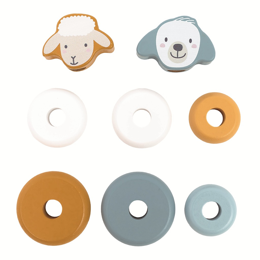 Ovečka nebo pejsek? Kdo udrží rovnováhu? Zábavná balanční hračka, která spojuje skládání, nasazování na tyč, objevování i trošku fyziky! Na jedné straně ovečka, na druhé straně pejsek, které si děti samy sestaví z dřevěných kroužků a hlavičky nasazením na tyč. Plošina se při každém pohybu naklání. Kdo poskládá zvířátka tak, aby byla v rovnováze?