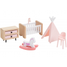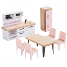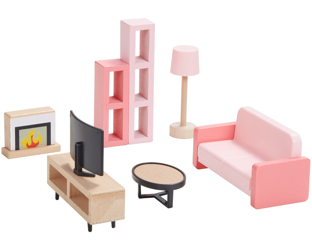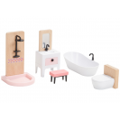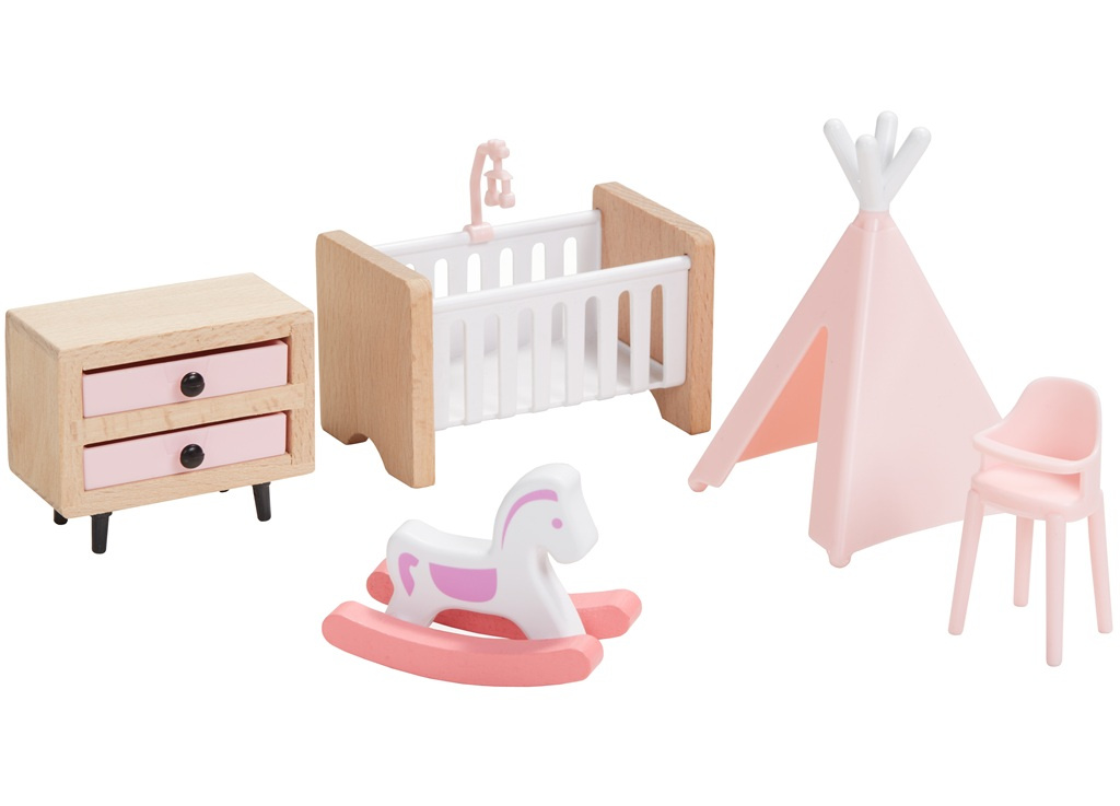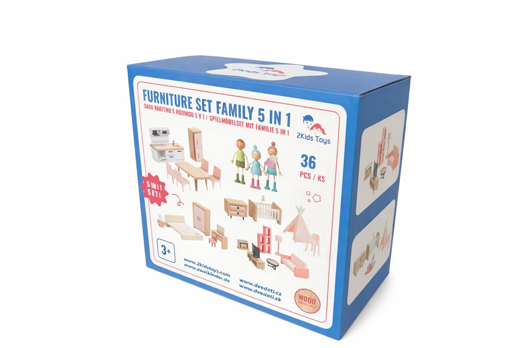 Skvělá sada dřevěného nábytku, díky které si můžete vybavit jakýkoli domeček. 5 v 1, to je ložnice, kuchyně, obývací pokoj, dětský pokoj,koupelna a k tomu i celá rodinka. Nádherně detailní dřevěné kousky pomohou mladým představám znovu a znovu vytvářet okouzlující interiérové scény. Skládá se z 36 kusů. Žádný domeček pro panenky není kompletní bez této sady!