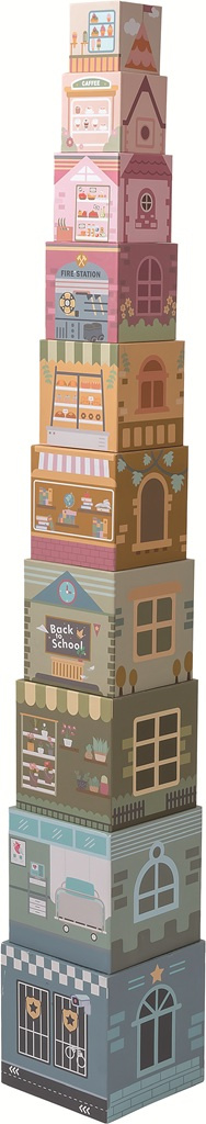 Skládání je zábava! Tato dřevěná věž v jemných pastelových barvách se skládá z 10 kostek různých velikostí, které děti mohou stavět na sebe jako vysoký mrakodrap nebo rozložit vedle sebe jako městečko. Každá kostka představuje jinou městskou budovu. Najdete zde nemocnici, školu, knihkupectví, květinářství i supermarket. Na stranách kostek jsou detailní ilustrace budov a 6 kostek má také okýnko, kde si děti mohou schovat dřevěné figurky, roztomilé zvířecí postavičky, které představují různá povolání. Víte, do kterého domečku patří slon, pejsek nebo lev? Díky skládání, třídění a hraní si děti rozvíjejí motoriku, logiku, kreativitu i porozumění tvarům, barvám a rolím ve městě. Věž lze snadno skládat a rozkládat a díky tomu je ideální nejen na doma, ale i na cesty. Poslouží také dobře jako kulisy, rozvíjí fantazii dětí a povzbuzuje k představivé hře. Ať už jako věž nebo kulisy ke hře, hračka přináší nekonečné možnosti zábavy!