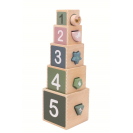 Čísla, tvary, barvy a zvířátka! Skládání je zábava! Tato dřevěná věž v jemných pastelových barvách se skládá z 5 kostek různých velikostí, které děti mohou stavět na sebe nebo rozložit vedle sebe. Na každé kostce je vyobrazeno roztomilé zvířátko, dobroty, kterými se živí, a číslo, které vyjadřuje počet zobrazených dobrot. Na jedné straně mají kostky otvor pro vhazování různých tvarů.