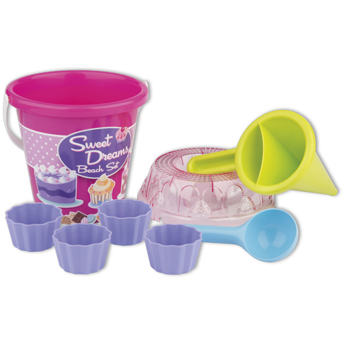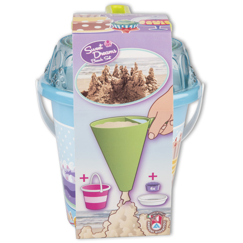 7dílná sada na písek vyrobená z kvalitních plastů v Itálii. Sada obsahuje: kyblík s víkem o průměru 17 cm, lopatku, 4 tvořítka ve tvaru bábovky a trychtýř. Mix 2 barev (růžové a světle modré). Pořadí preference barev napište do poznámky v objednávce. Zboží je expedováno dle aktuální skladové dostupnosti. Kyblík: průměr 17 cm, výška 22,5 cm. Vhodné pro děti od 1 roku.