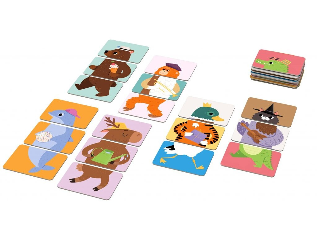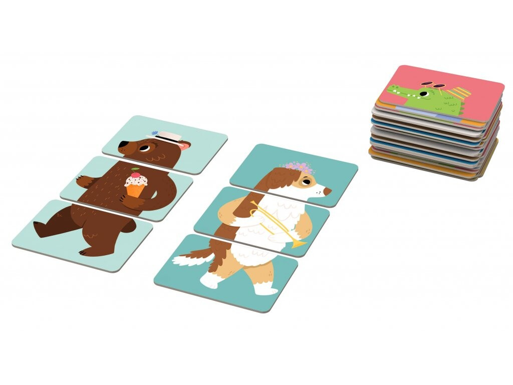 Podporuje rozvoj motorických dovedností, fantazie a kreativního myšlení. Díky 18 kartám z pevného kartonu a 12 druhů zvířátek mohou děti objevovat nejen klasické podoby zvířat, ale i vytvářet vtipné a nečekané kombinace.