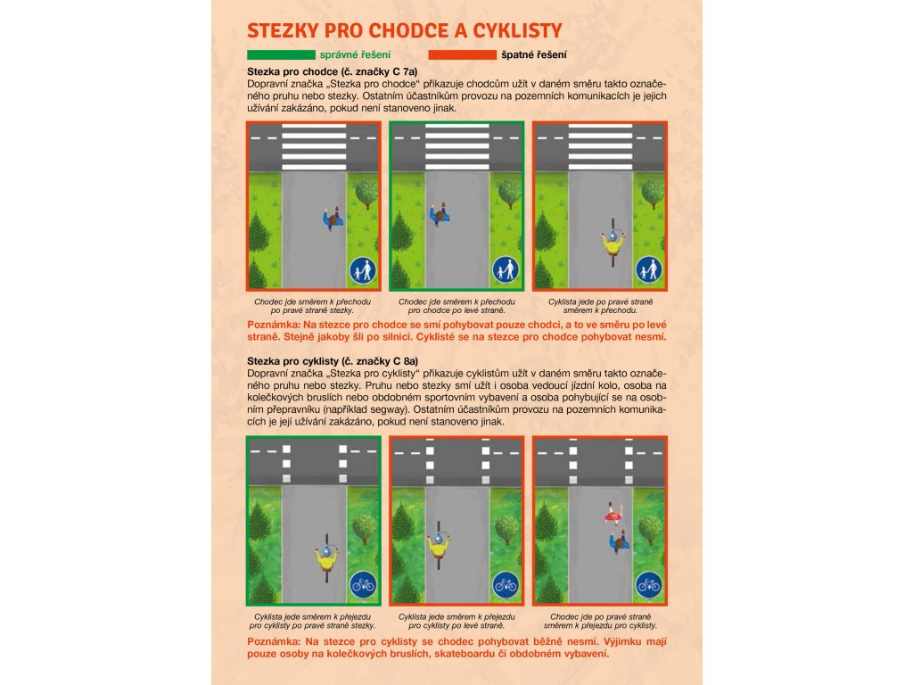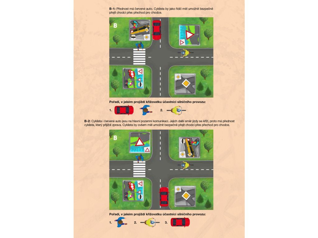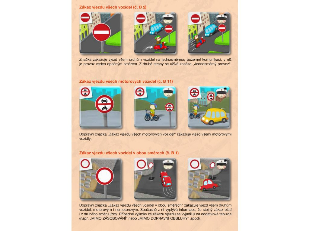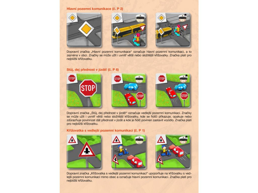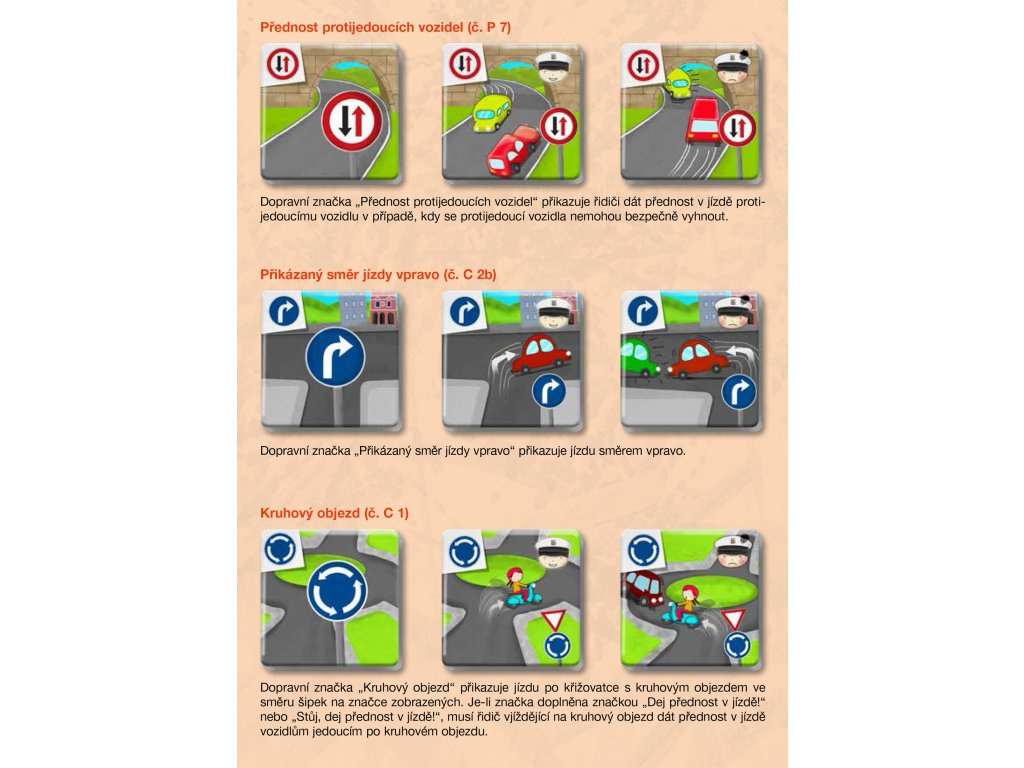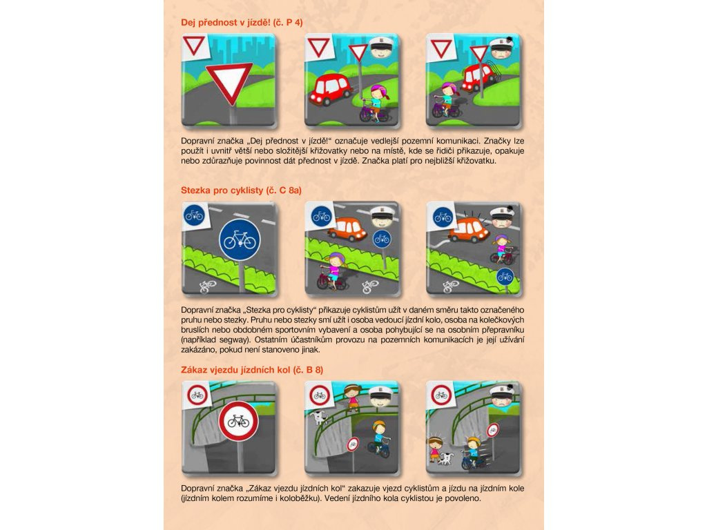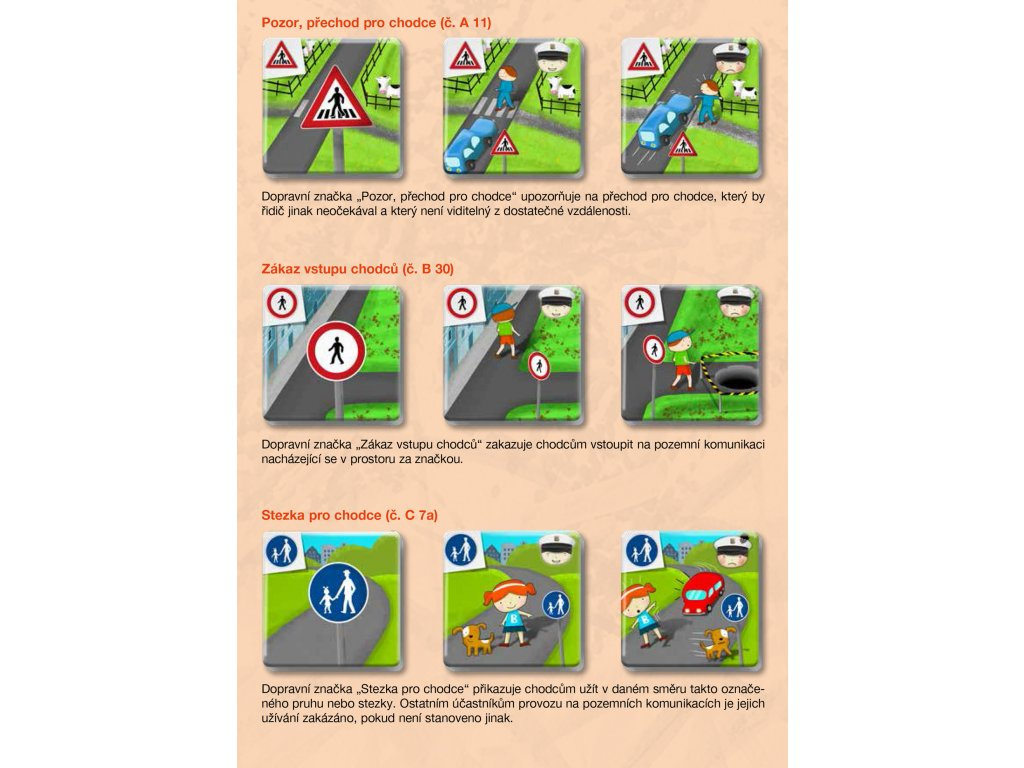 72 kartiček = 24 dopravních značek - trojic: 1. obrázek = dopravní značka, 2. obrázek = situace při dodržení pravidel, 3. obrázek = porušení pravidel, které dopravní značka předepisuje