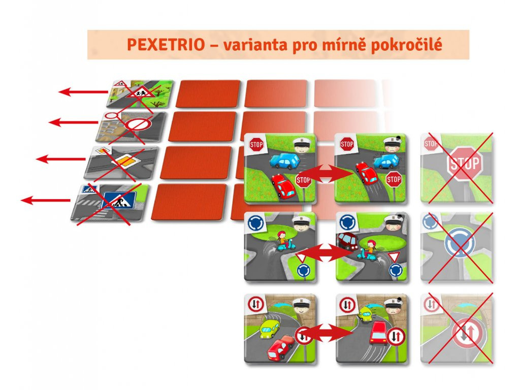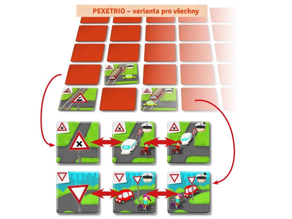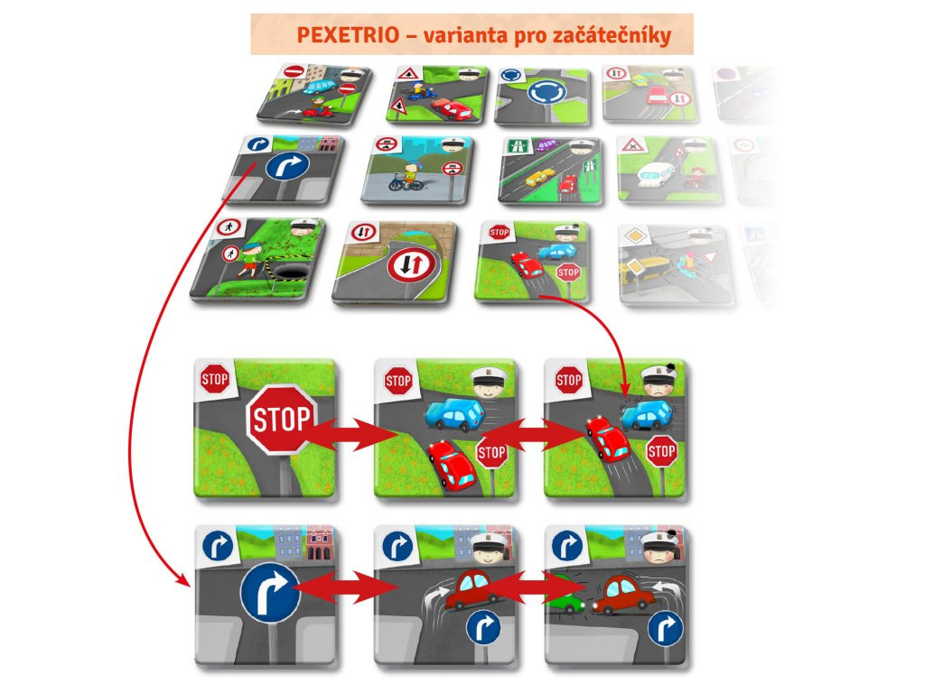 Sada mimo jiné obsahuje podklady pro testy 20 dopravních situací, které se děti musí učit již v raném věku jako chodci nebo cyklisté. Další z herních variant jsou založeny na hledání dvojic či trojic kartiček, tak jak to znáte z jiných her české značky Pexetrio.