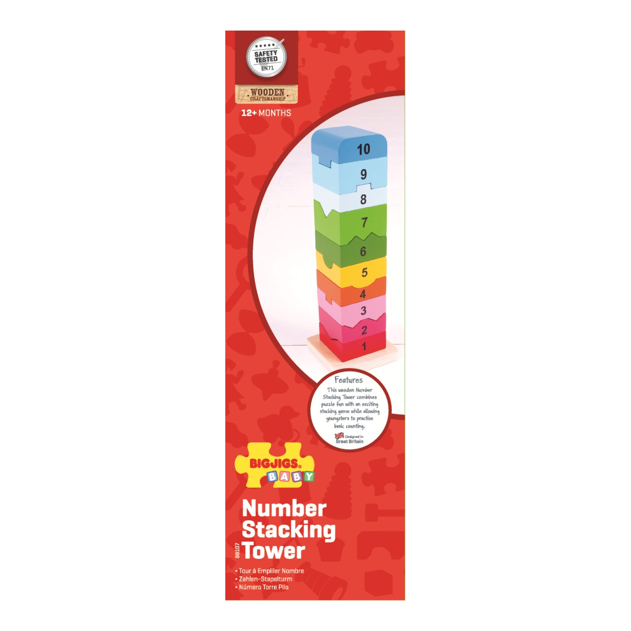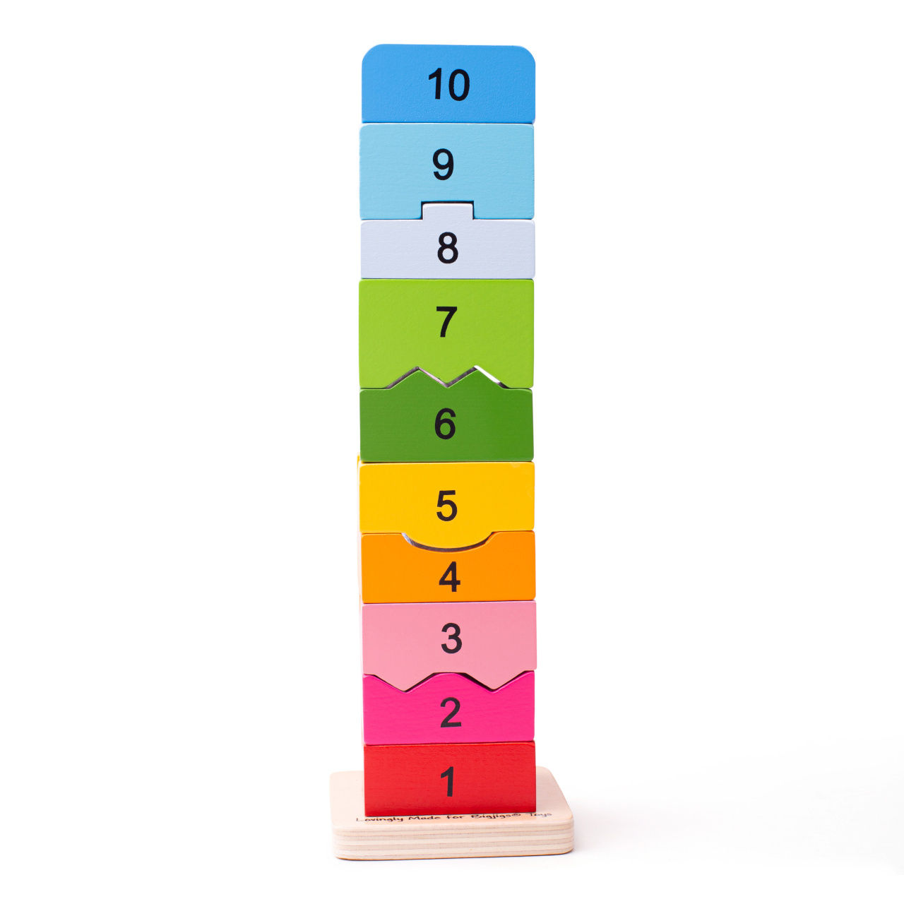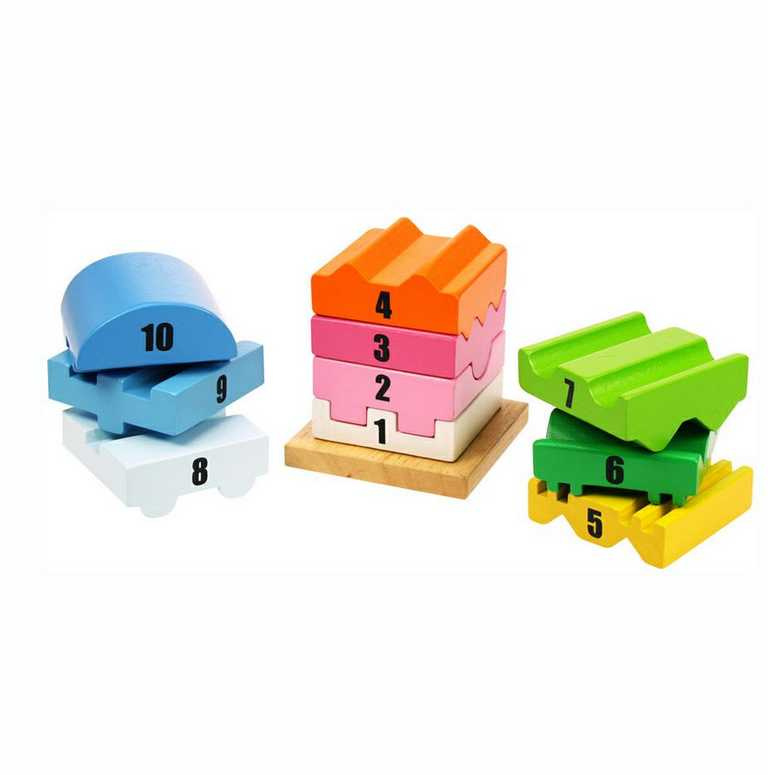 Stavěj věž a počítej bloky. Tak by se dala nazvat tato dřevěná očíslovaná věž v mnoha barvách, kde má každý barevný blok své číslo a vaše dítě se při jeho stavbě učí, jak napočítat od jedné do deseti. Jednotlivé bloky jsou skládačkového typu, dítě se tak učí dávat správné tvary k sobě. Každá jednotlivá kostka má specifický tvar, takže do sebe zapadají jen tak, jak jsou očíslovány. Bez středové tyče. Vyrobeno z vysoce kvalitních materiálů ze zodpovědných zdrojů. Vyhovuje současným evropským bezpečnostním normám. Obsahuje 11 dílů.