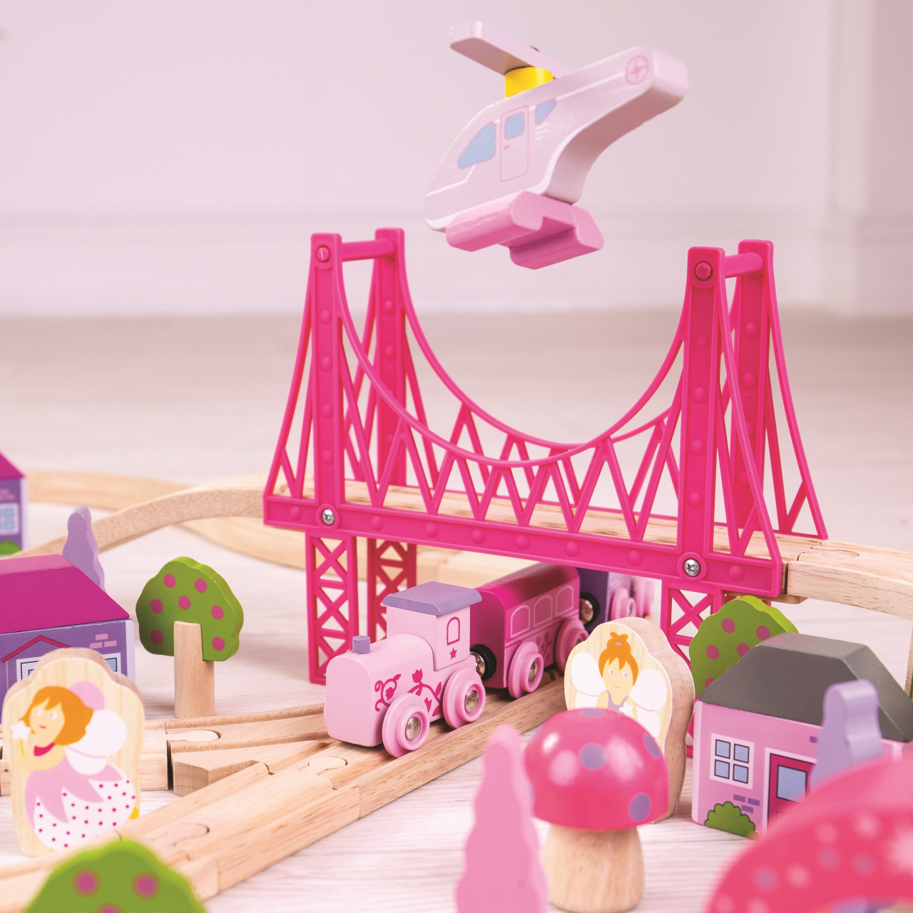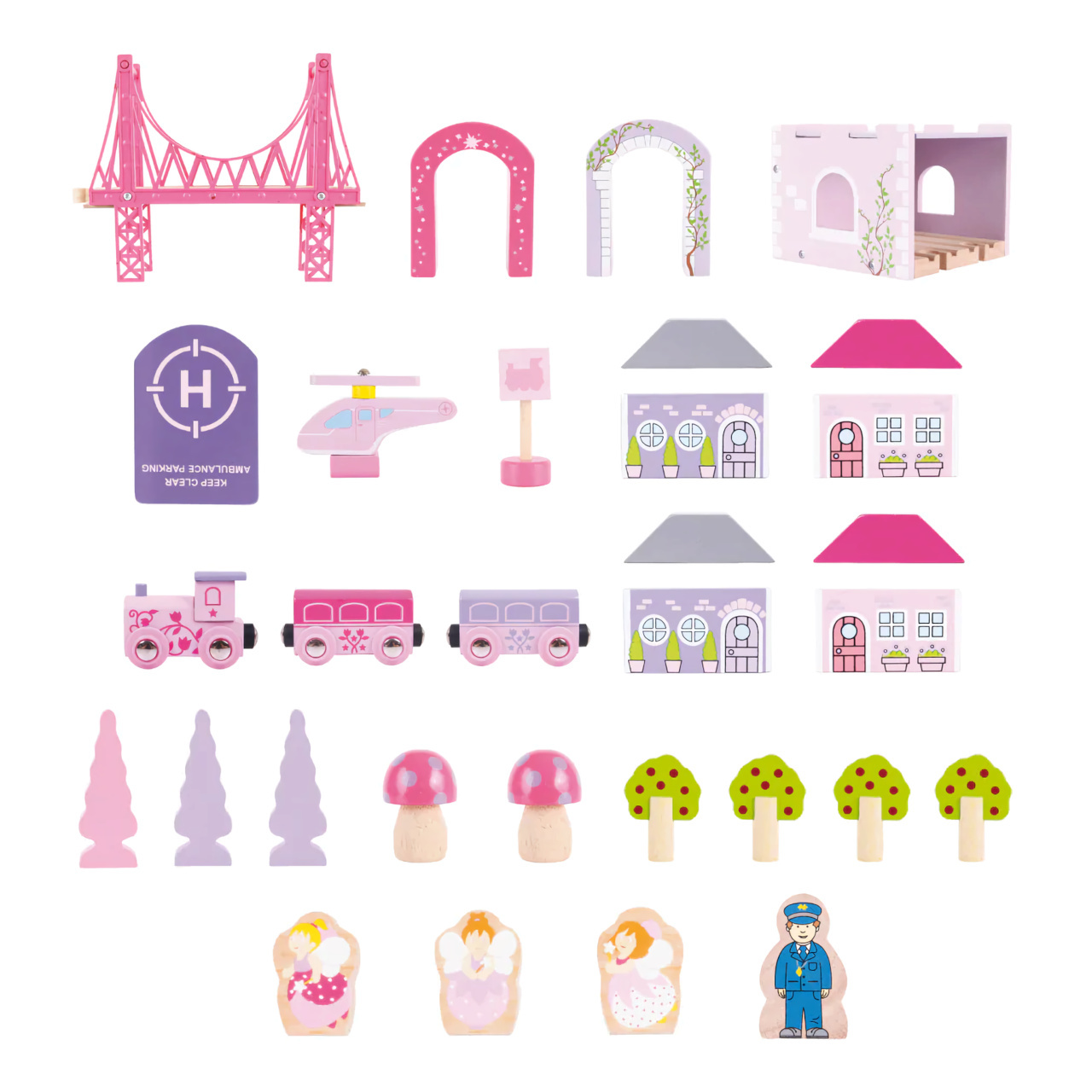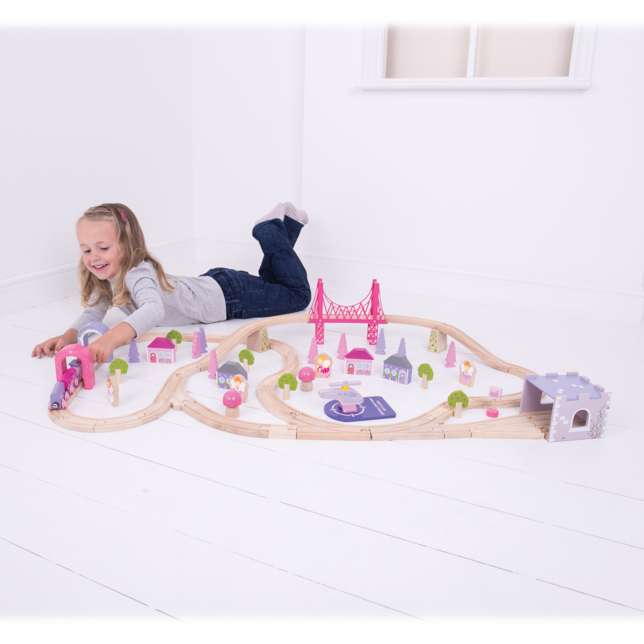 Originální vláčkodráha nejen pro malé slečny s veškerým příslušenstvím, 75 kusů v odstínech růžové a fialové.