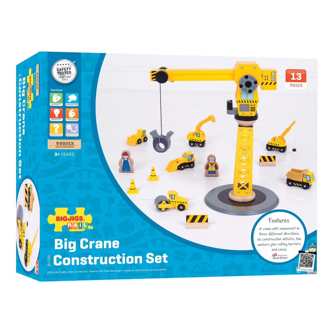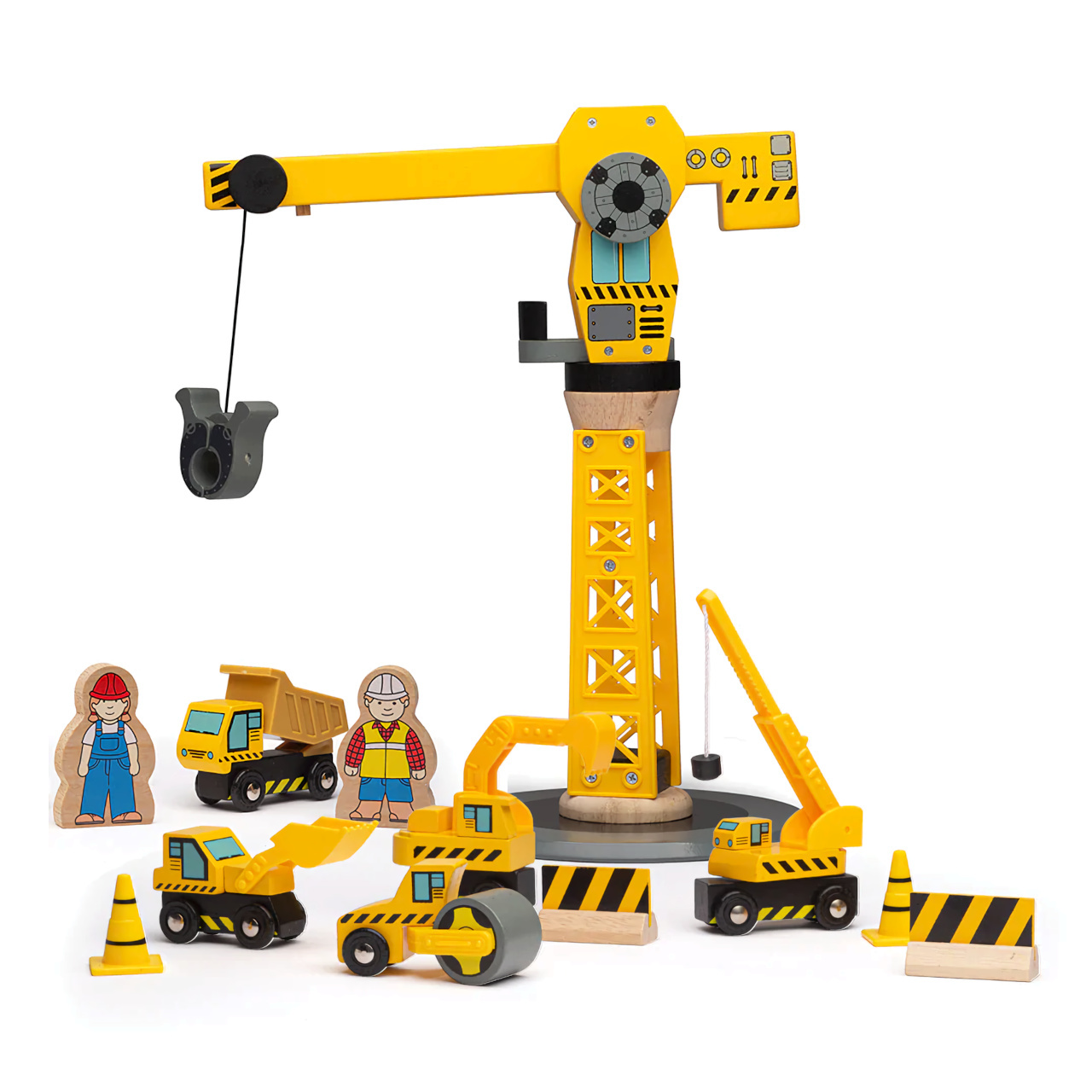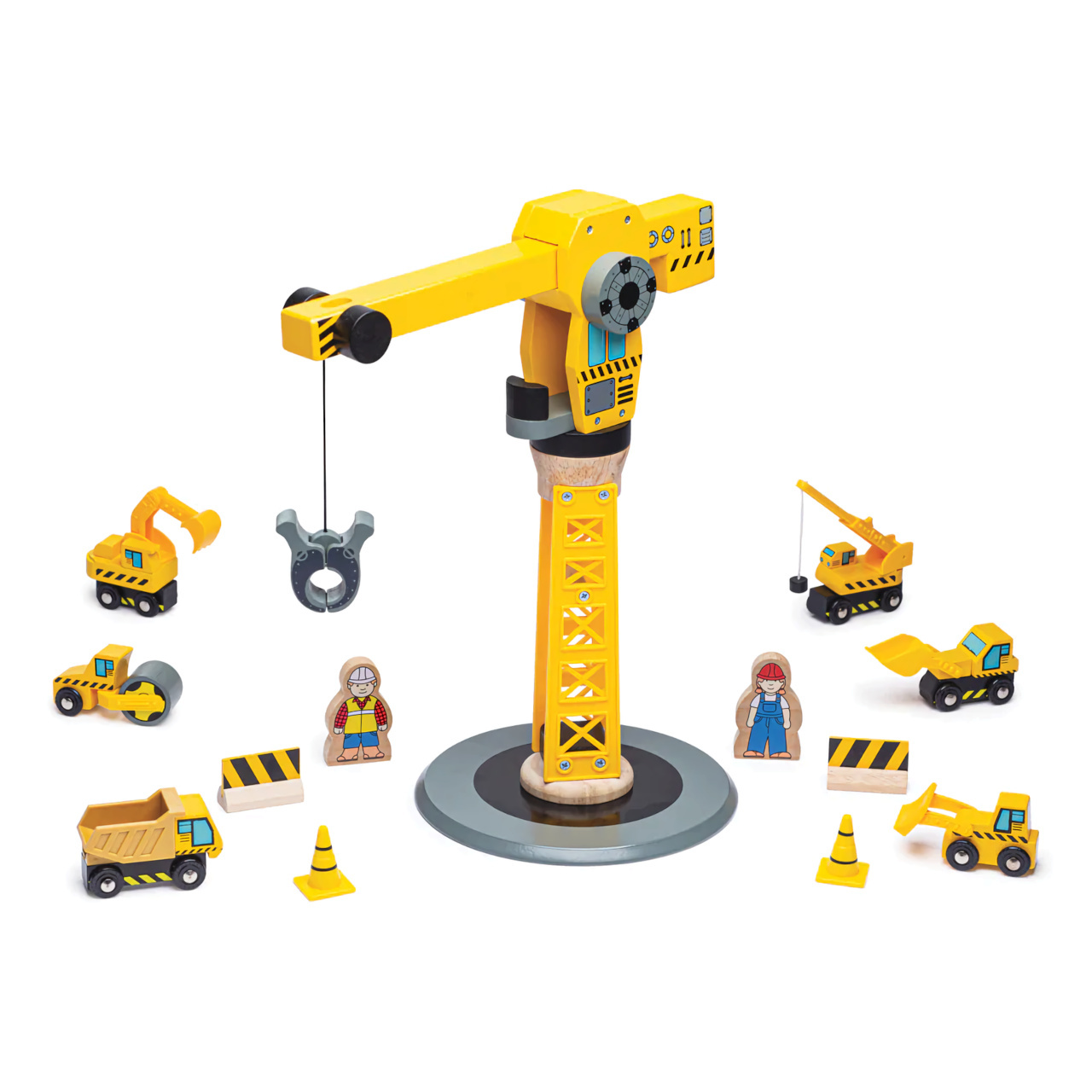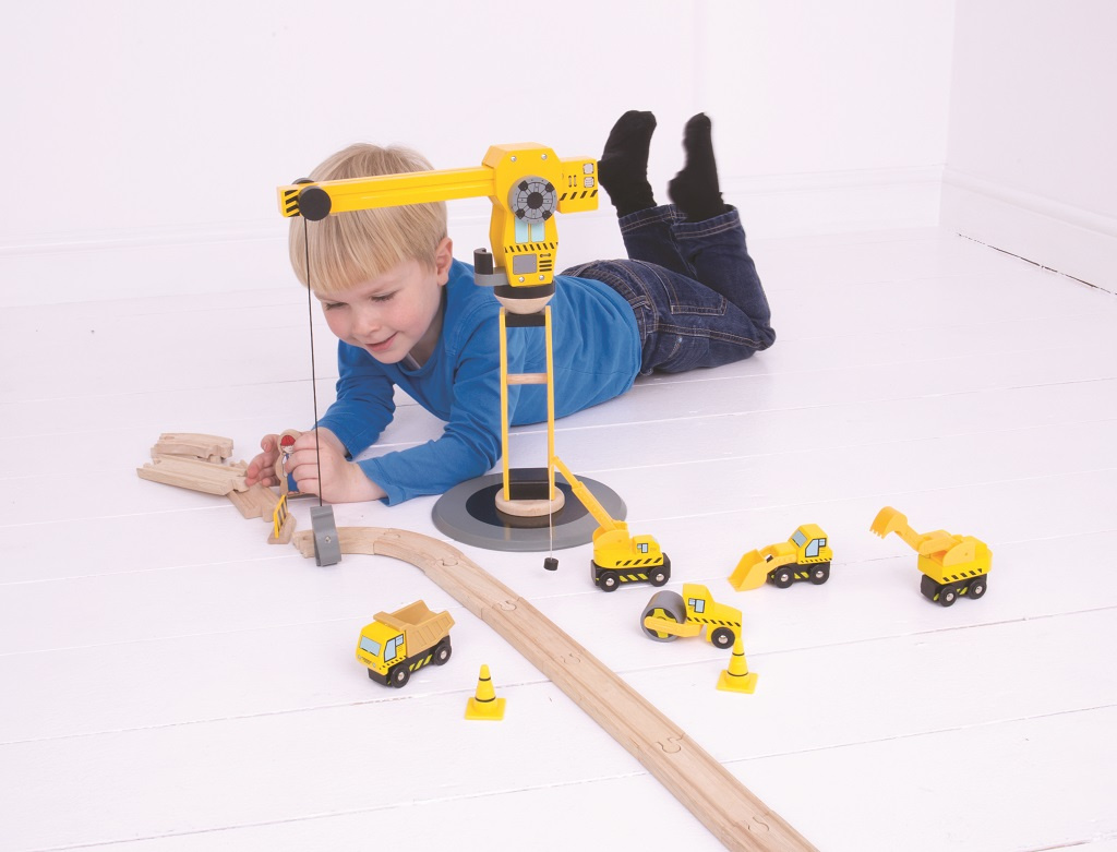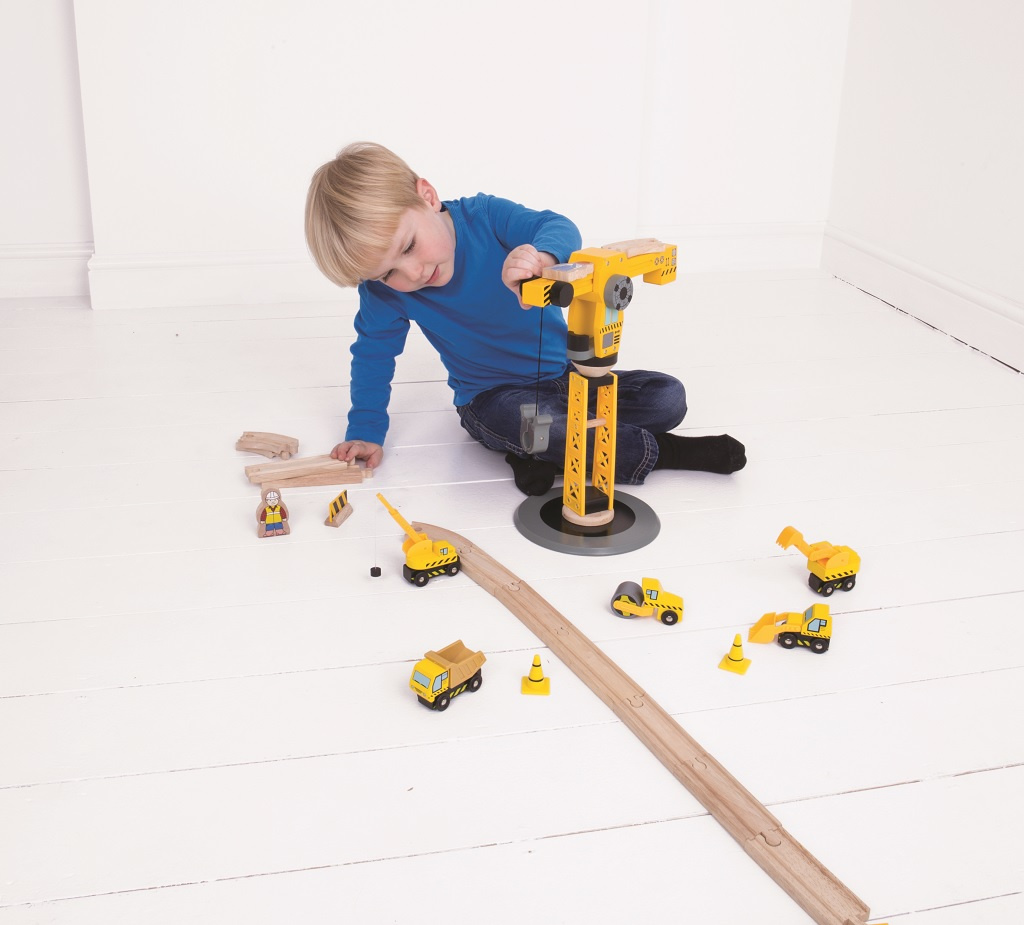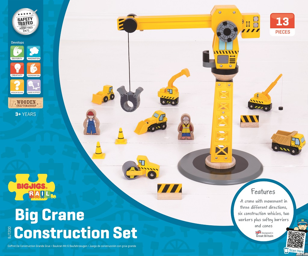 Ideální dárek pro každé dítě, které má dřevěnou vláčkodráhu nebo má jen rádo stavební stroje! Tato sada obsahuje velký jeřáb, několik různých stavebních strojů, dva pracovníky, kužely a zábrany, vše ideální pro nápadité hry. Děti se s toutou hračkou nemohou nudit!