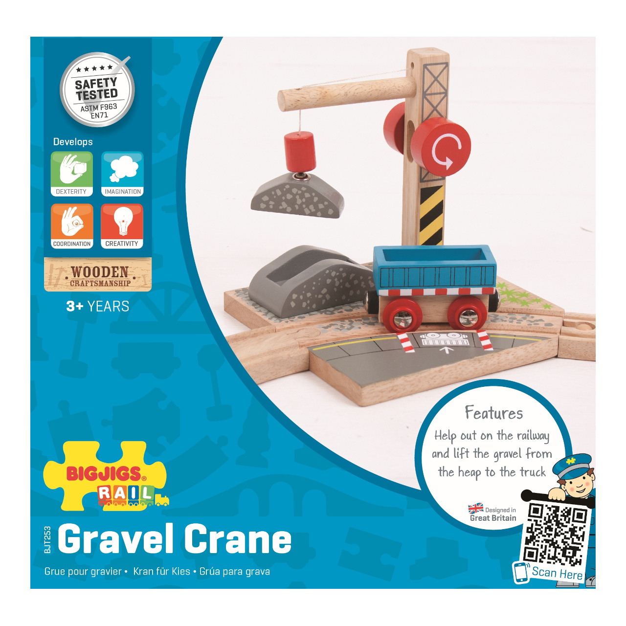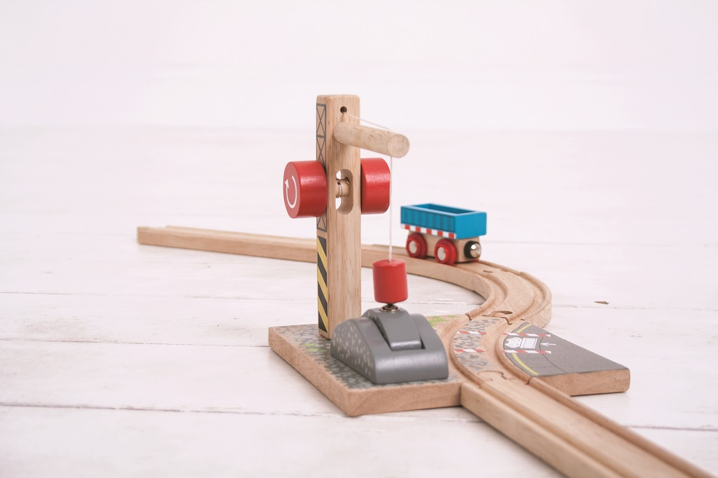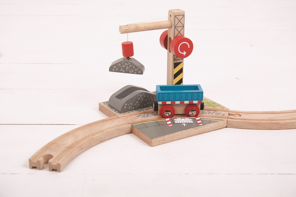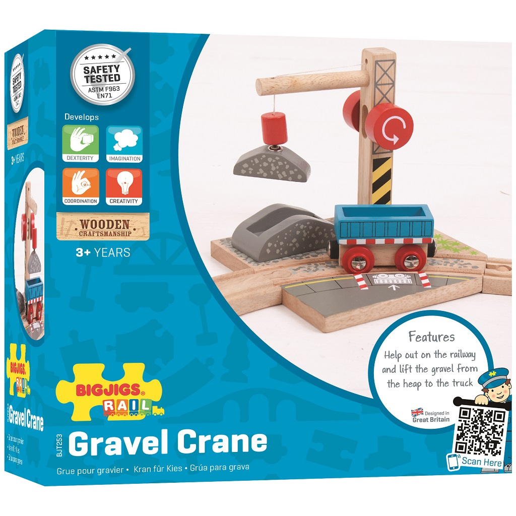 Tento funkční dřevěný štěrkový jeřáb s kladkou dodává trati další vzrušující prvek. Magnetická kladka pracovního jeřábu umožňuje zvednutí nákladu štěrku a jeho naložení na vozík připravený k přepravě. Podporuje představivost, zručnost a koordinaci.