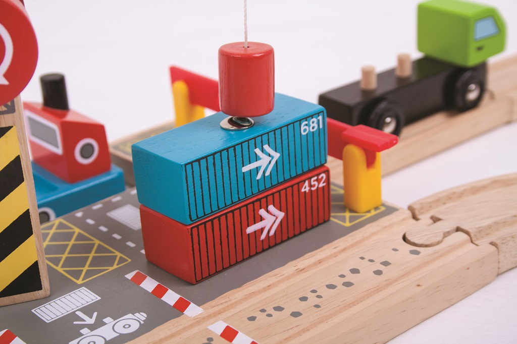 Toto překladiště zvýší dětskou představivost a hraní si na reálný svět! Set obsahuje dřevěné nákladní auto s kontejnery, dřevěný jeřáb. Set slouží k překládání nákladu z auta nebo vagónku na loď pomocí magnetického jeřábu.