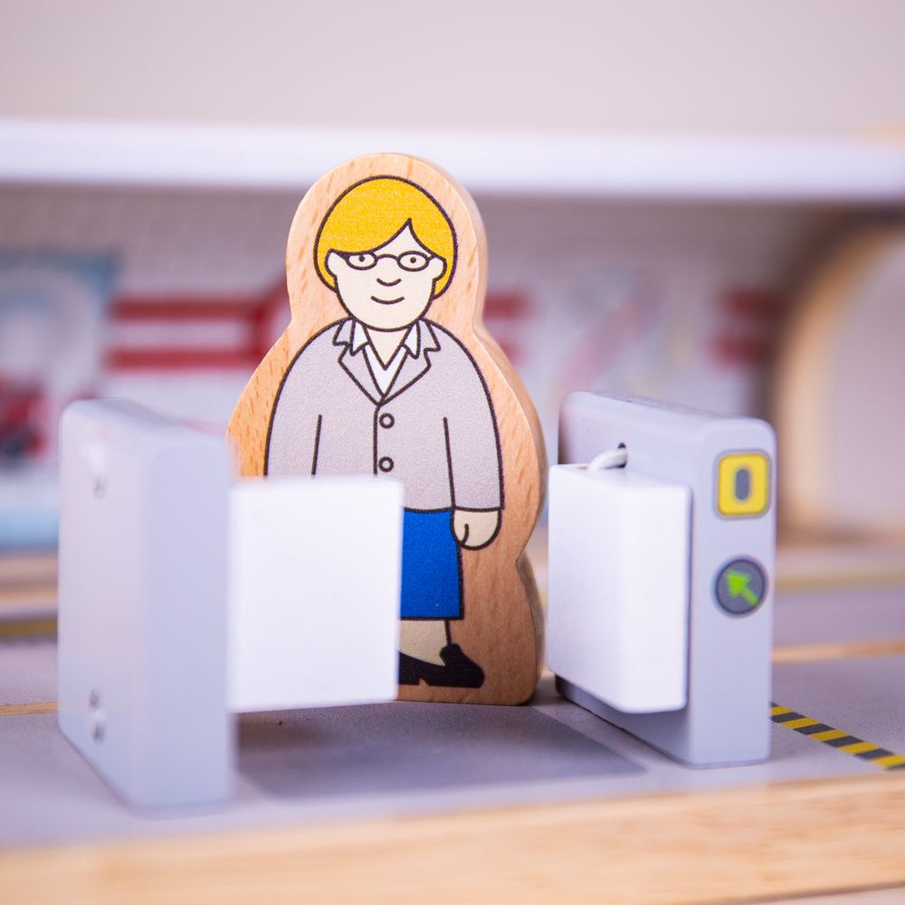 Tato dřevěná hračka obsahuje automat na jízdenky, bránu pro označení jízdenek a 3 postavičky pasažérů.