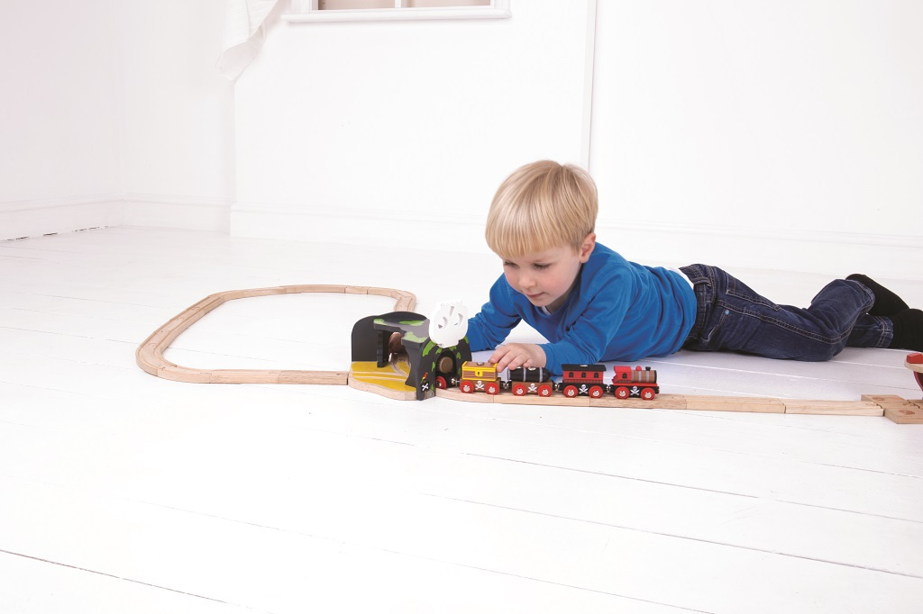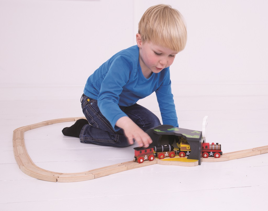 Dřevěný tunel jeskyně lebka - dva vchody nebo východy tunelu. Lebky jsou na provázku, jsou tedy otevírací. Podporuje představivost, zručnost a koordinaci. Většina ostatních hlavních značek dřevěných železnic je kompatibilní s Bigjigs Rail.