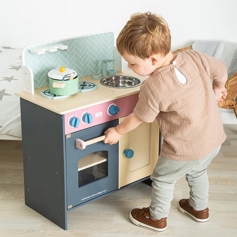 Dětská kuchyňka, v které mohou děti připravit představivou snídani do postele pro své rodiče. Vypadá jako pravá a najdete v ní sporák, troubu, skříňku pod dřezem, dřevěný hrnec a pánev, také naběračku a vařečku. Malí šéfkuchaři a šéfkuchařky si užijí představivou hru, mohou navařit i pro své plyšáky nebo kamarády. Stylová dřevěná kuchyňka v tlumených barvách se bude vyjímat v každém pokoji. Doplnit můžete dřevěným jídlem z naší nabídky.