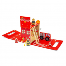Vydejte se na záchrannou misi kdykoli a kdekoli! Tato kompaktní hasičská stanice je součástí kolekce přenosných herních sad a díky skládacím plstěným bokům se snadno sbalí i přenáší. Sada nabízí vše, co malý hasič potřebuje pro dobrodružnou hru na cestách. Děti si mohou přehrávat napínavé záchranné akce s hasičským autem, dvěma figurkami hasičů a dalšími doplňky. Dřevěná stanice zároveň slouží jako praktické úložný box i herní prostor. Nechybí ani žebřík, hadice, bezpečnostní kužel a požární hydrant, které rozšiřují možnosti kreativního vyprávění. Hra podporuje rozvoj fantazie, komunikačních dovedností i sociální interakce při společném hraní. Díky kompaktnímu provedení, snadnému úklidu a pevné rukojeti je sada ideální na cesty, dovolenou i návštěvy. Vyrobeno z kvalitního FSC® certifikovaného dřeva z udržitelných zdrojů. Sada je odolná, bezpečná a dodává se ve 100% recyklovatelném balení bez plastů – skvělá volba pro ekologicky smýšlející rodiny.
