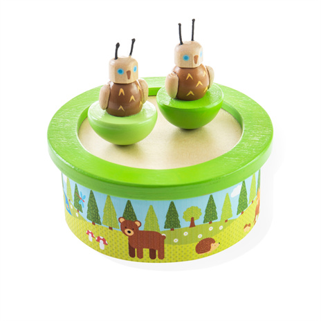 Natočte je a dívejte se, jak pochodují! Tato krásná dřevěná, hudební skříňka má na sobě 2 postavičky, které tančí, kolébají se a otáčejí se v rytmu písně. Děti si tuto hračku jistě zamilují. Postavičky soviček jsou ke skřínce připevněny neviditelnými magnety, ale mohou být jednoduše odděleny a děti si s nimi mohou hrát i jinde. Krásný doplněk do herny nebo dětského pokoje. Podporuje děti v kreativním a představivém hraní. Vyrobeno z kvalitních materiálů z odpovědných zdrojů. Odpovídá evropské bezpečnostní normě.