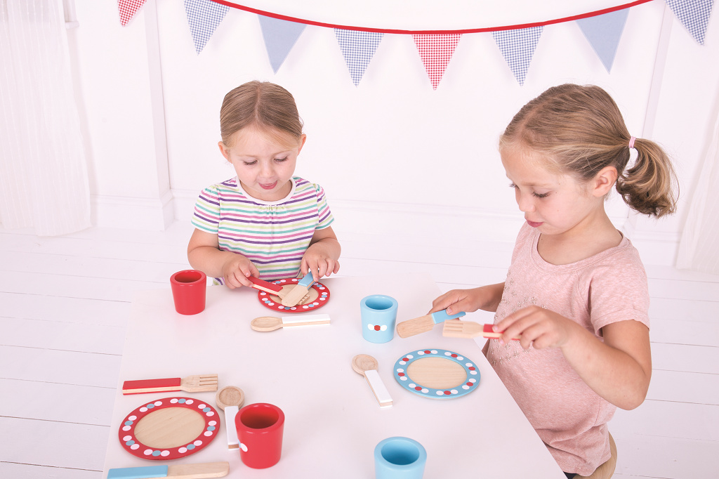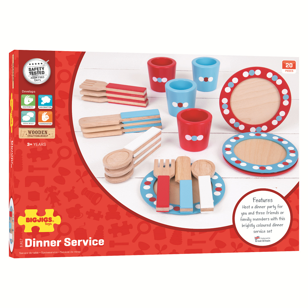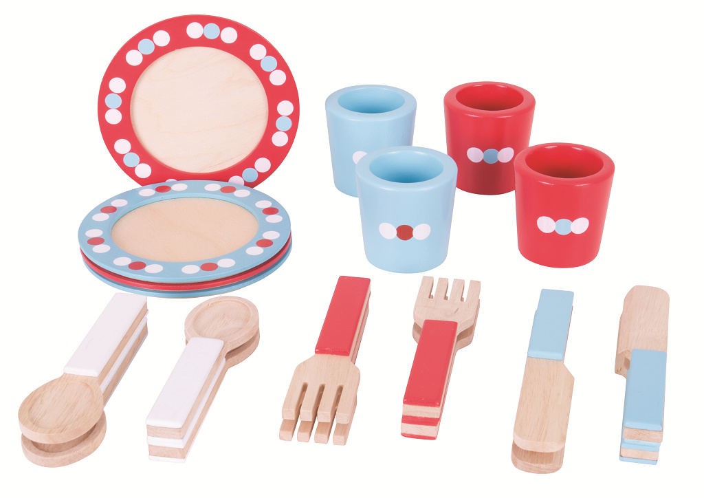 Začínající mladí kuchaři mohou nachystat vlastní večeři a uspořádat čajové dýchánky s touto barevnou dřevěnou jídelní sadou. Set je dodáván se 4 dřevěnými talíři, hrnky, noži, vidličkami a lžícemi, což z ní dělá skvělý doplněk do každé dřevěné kuchyňky na hraní. Dřevěná sada nádobí Bigjigs Toys, která nabízí hodiny zábavy a nekonečné herní možnosti, je skvělým způsobem, jak podpořit nápaditost a kreativitu. Vyrobeno z vysoce kvalitních, zodpovědně získaných materiálů. Splňuje aktuální evropské bezpečnostní normy.