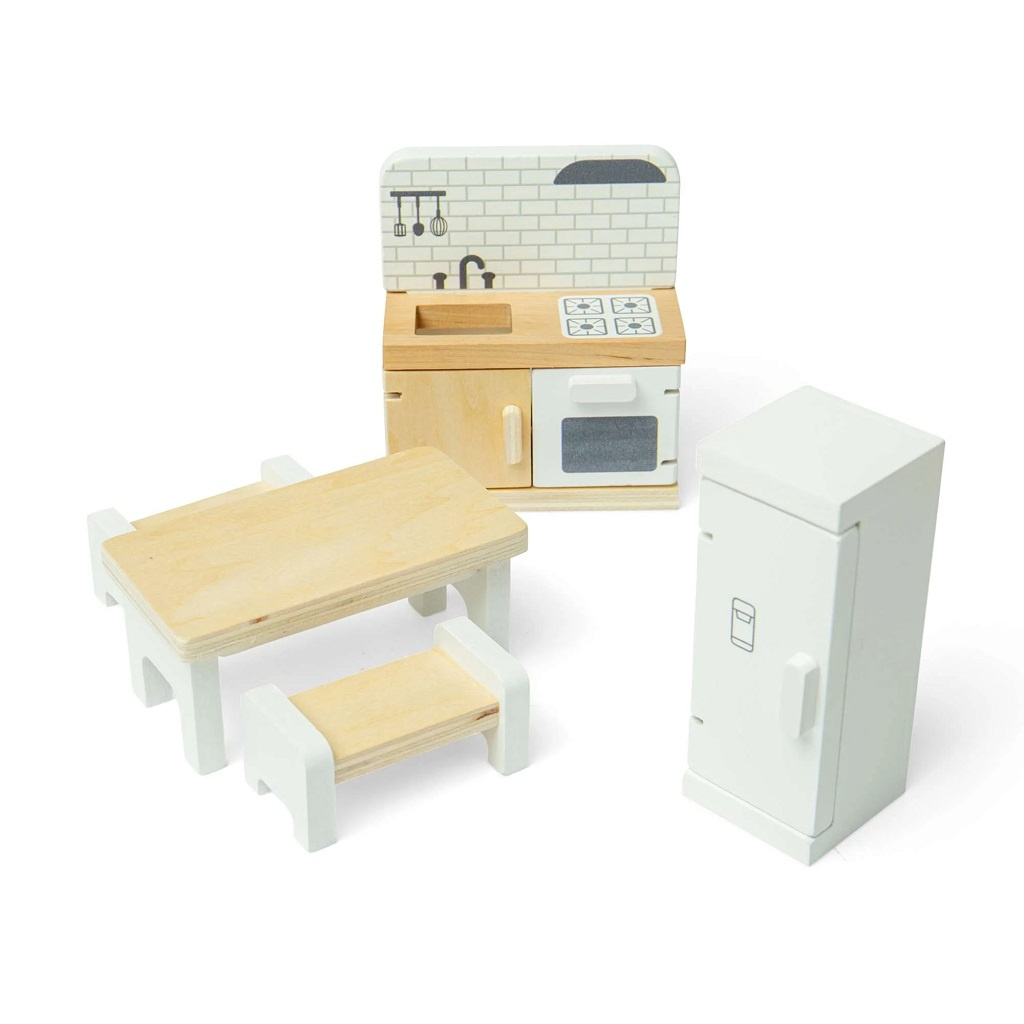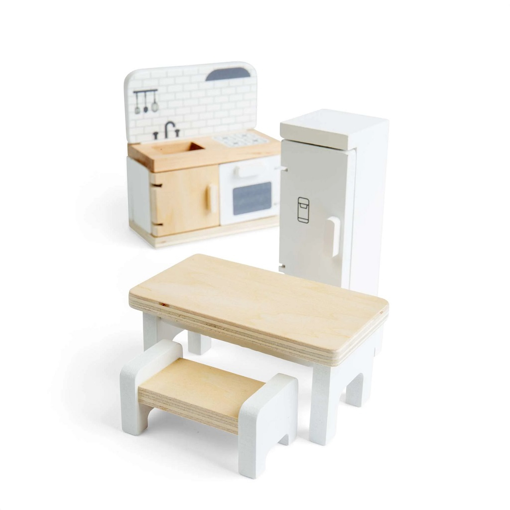 Proměňte domeček pro panenky v útulný domov plný vůní a společných chvil s touto stylovou kuchyňskou sadou. Děti mohou připravovat imaginární jídla, servírovat svačiny a usazovat panenky ke společnému stolu – fantazii se meze nekladou. Moderní kuchyňská sada nabízí realistické prvky, které podporují hraní rolí i vyprávění vlastních příběhů z každodenního života. Při manipulaci s jednotlivými dílky si děti přirozeně rozvíjejí jemnou motoriku, koordinaci rukou a očí i sociální dovednosti. Nábytek je vyroben z kvalitního, odpovědně získaného dřeva s certifikací FSC®, takže je bezpečný, odolný a šetrný k životnímu prostředí. Sadu lze kombinovat s dalšími doplňky do domečku pro panenky a vytvořit tak kompletně vybavený domov.