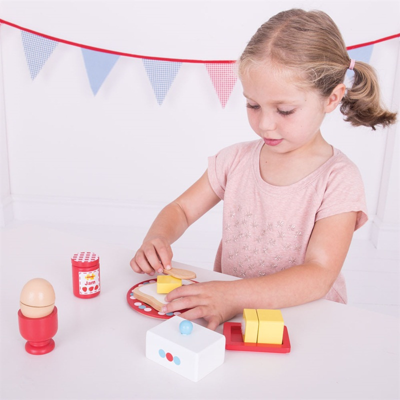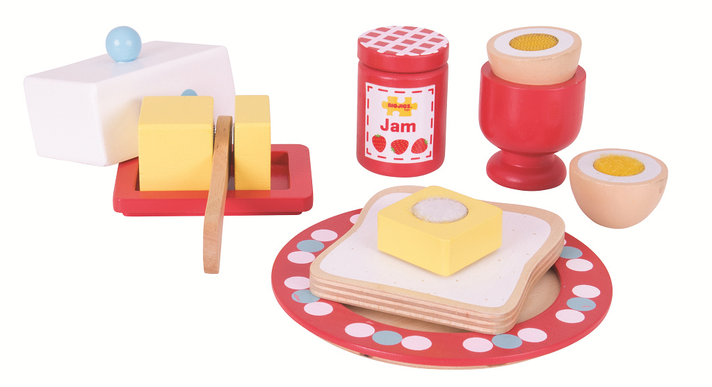 Podávejte vyváženou snídani s touto barevnou dřevěnou snídaňovou sadou, která obsahuje vejce, chléb, máslo a džem. Dodáváno s dřevěným nožem na namazání chleba a potření džemem a dokonce i na rozklepnutí vajíčka. Sada dále obsahuje dřevěný kalíšek na vejce, talíř, nádobu na máslo a víko. BigJigs je velký fanoušek zdravé výživy a jaká by byla lepší cesta učit děti o zdravé výživě, než pomocí hraček z našeho sortimentu? Dřevěné hrací jídlo je ideální k tomu, aby se vaše dítě dozvědělo o důležitosti zdravé a vyvážené stravy. A také o tom, odkud naše jídlo pochází a jak ho připravujeme.