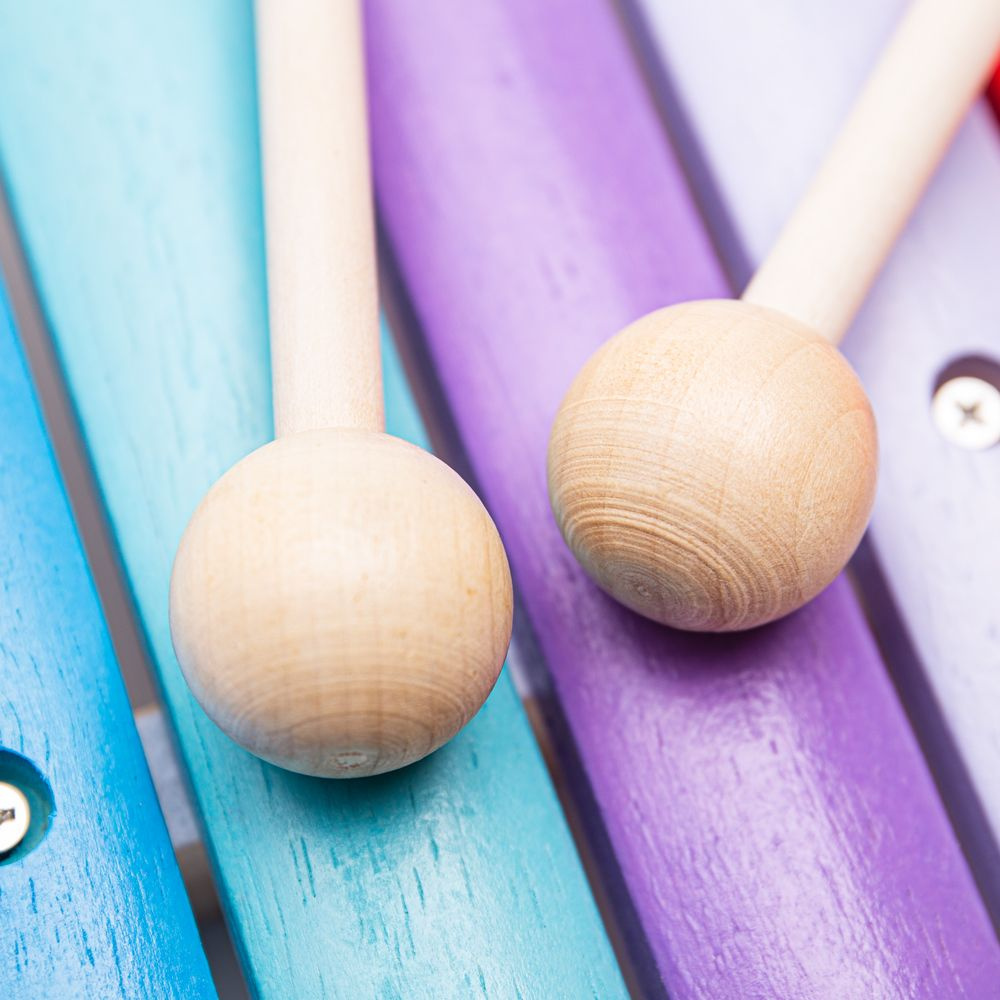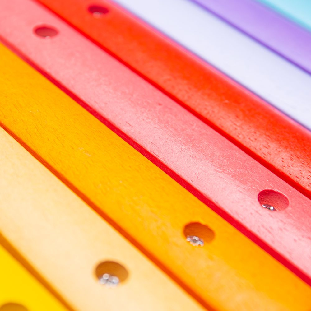 Co může být lepšího než dřevěný a barevně pestrý xylofon? Vaše dítě si může vytvářet své první melodie, nebo hrát své oblíbené písničky, a díky tomu tato hračka nebude pro něj zklamáním, ale velkou zábavou. Vhodná hračka i pro vaše batole. Oproti obrázku je na xylofonu viditelné uchycení klapek malými šroubky.