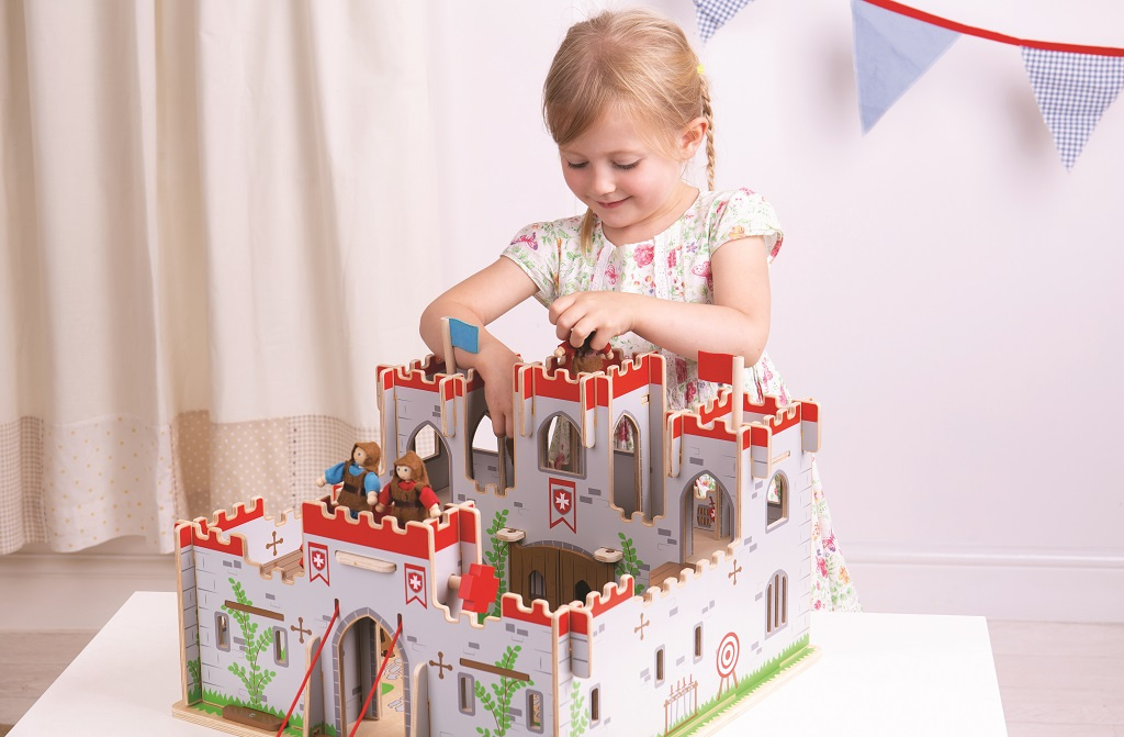 Dřevěný hrad krále George obsahuje plně funkční padací most, balkóny a pohyblivé dveře. Najdete zde i tajné dveře, kterými rytíři vyklouznou ven bez toho, aby je spatřil nepřítel! Mějte hrad pod kontrolou díky padacímu mostu, vyměňujte červené a modré vlajky podle toho, kdo hrad dobyl. Užívejte si magickou hru, nezapomeňte ale být stále ve střehu! Jednoduše složte dřevěné dílky do sebe a dobrodružství může začít. Je to skvělý způsob jak rozvíjet vypravěčské dovednosti, slovní zásobu a zručnost u dětí. Vyrobeno z kvalitních materiálů z odpovědných zdrojů. Postavičky nejsou součástí balení, lze je dokopit.