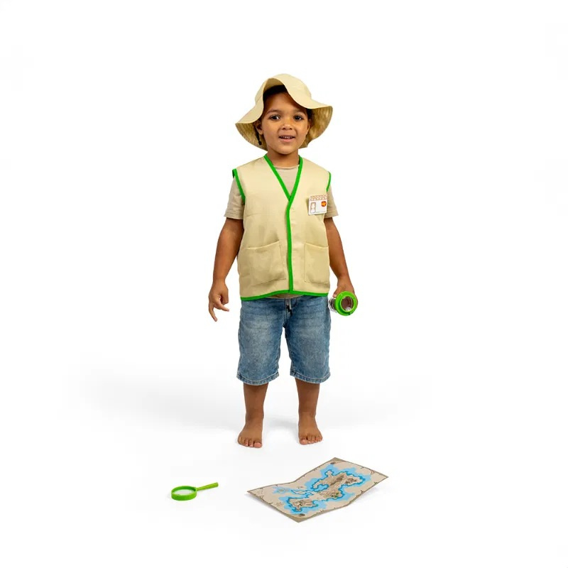 Vydejte se na cestu za poznáním! Sada obsahuje vše, co malí průzkumníci budou potřebovat, aby prožili spoustu dobrodružství. Součástí sady je vesta, klobouk, jmenovka, podrobná mapa, lupa, dřevěné fosilie, kompas a speciální lupa na pozorování hmyzu. Dětské kostýmy jsou vynikající pro pochopení světa a mohou inspirovat budoucí kariéru. Příslušenství průzkumníka také povzbuzuje děti, aby trávily čas venku a učily se o přírodě pohlcujícím a praktickým způsobem. Kostým průzkumníka je vyroben z materiálů prvotřídní kvality a byl testován podle nejnovějších předpisů.
