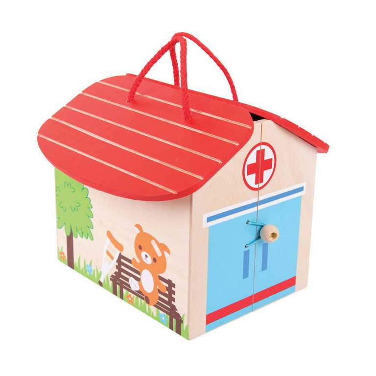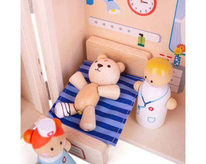 Pan Medvěd se praštil do hlavy! Tato pestrobarevná dřevěná mini nemocniční herní sada má uvnitř i zvenčí funkcemi prvky a je dodávána s nemocničním lůžkem, lékařskou kapačkou, srdečním monitorem, medvědem, sestřičkou a lékařem. Rukojeť a bezpečná spona zajišťují, že tato sada je vždy připravena cestovat s vaším malým dítětem a zároveň jsou všechny herní prvky bezpečně uloženy uvnitř. Vyrobeno z vysoce kvalitních, zodpovědně získaných materiálů. Splňuje aktuální evropské bezpečnostní normy. Obsahuje 9 hracích prvků.