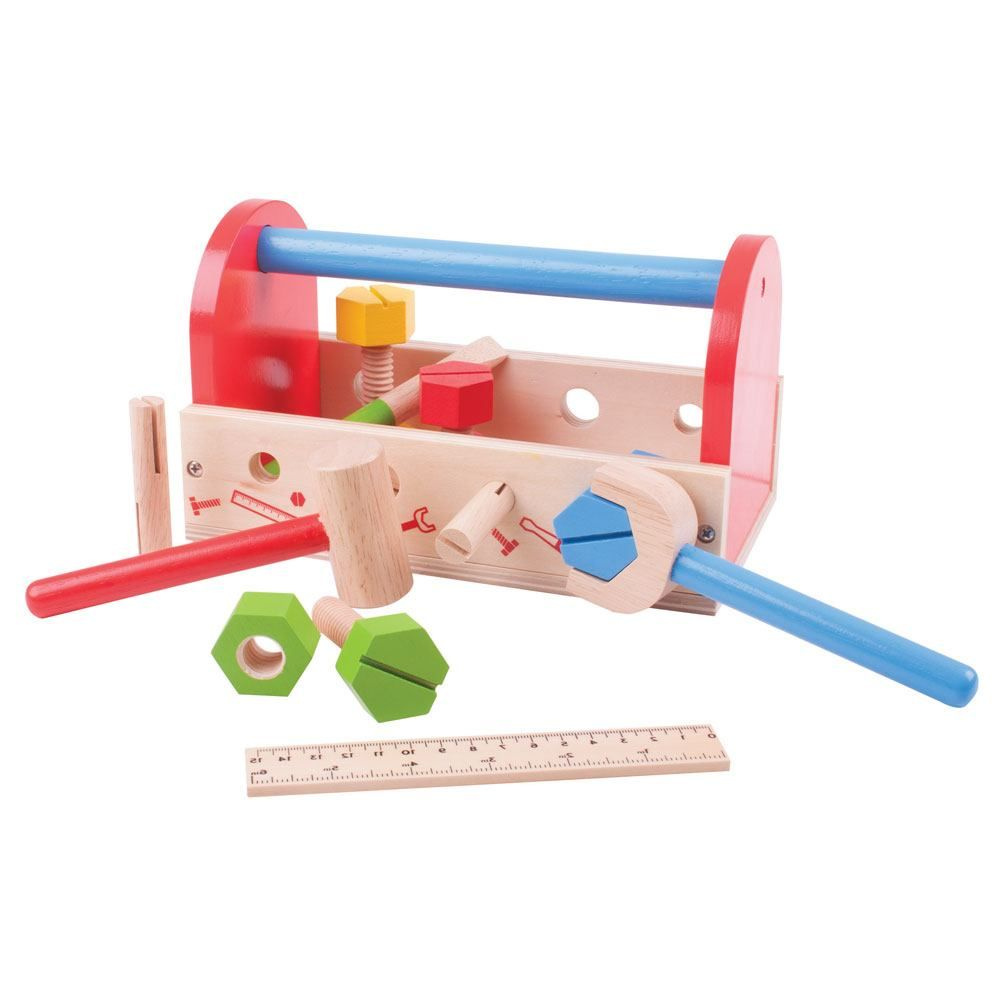 S klíčem, kladivem, maticemi a šrouby a dokonce i šroubovákem a pravítkem obsahuje tato přepravka na nářadí vše, co mladý kutil potřebuje, aby se mohl pustit do opravování! Robustní dřevěná přepravka na nářadí má vestavěnou rukojeť, takže si vaše ratolesti mohou vzít své nářadí s sebou na cesty! Pomáhá rozvíjet obratnost a koordinaci. Vyrobeno z vysoce kvalitních, zodpovědně získaných materiálů. Splňuje aktuální evropské bezpečnostní normy. Skládá se ze 16 hracích prvků.