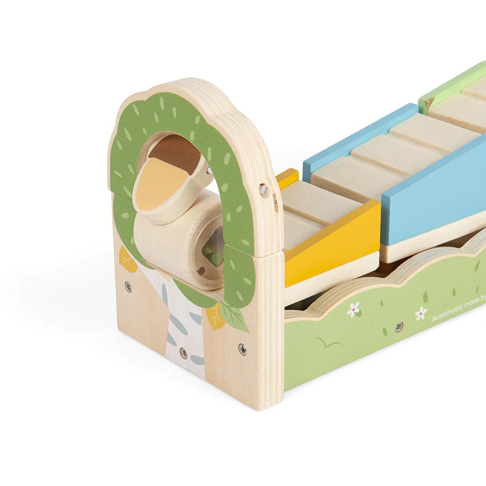 Motorická rampa s veverkou je dřevěná hračka pro děti, které si rády hrají a zároveň se učí novým věcem. Tato hračka poskytuje dětem příležitost rozvíjet své dovednosti a poznatky zábavným a interaktivním způsobem. Obsahuje tři barevné silikonové tvary (hvězdu, kostku a kříž), tři díly rampy a dřevěný chrastící váleček. Jakmile budou všechny dílky umístěny na svá správná místa, čeká vás další zábava. Umístěte chrastící váleček na vrchol rampy, použijte veverku k postrčení válečku dolů a sledujte, jak váleček dole naráží na žalud. Skvělé pro STEM výuku, která zapojuje do výuky kreativitu a nové způsoby vnímání technických předmětů. Podporuje kreativní myšlení, logické úsudky a také týmovou spolupráci. Vzdělávání formou hry je jedna z nejlepších metod, jak zapojit děti do učení, aniž by o tom měly ony sami tušení.