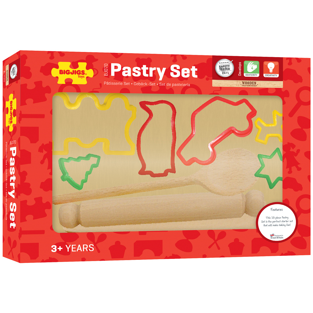 Ideální sada pro zábavu při pečení! Obsahuje vařečku, stěrku, prkénko a váleček. Dodáváno se šesti pestrobarevnými vykrajovátky na pečivo, včetně hvězdy, auta, psa, vánočního stromku, vláčku a tučňáka. Splňuje aktuální evropské bezpečnostní normy. Skládá se z 10 dílů.