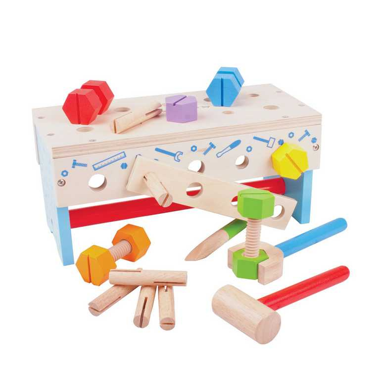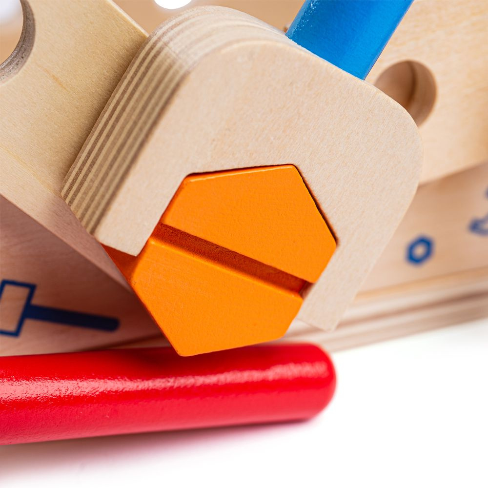 Tento chytře navržený dřevěný tesařský ponk obsahuje dřevěný klíč, kladivo a spoustu šroubů a matic. Když je čas vše uklidit, můžete ponk otočit vzhůru nohama a vše do něj uložit. Obsahuje vestavěnou rukojeť, takže dřevěná hračka může cestovat s vašimi dětmi! Skládá se z 18 hracích prvků.