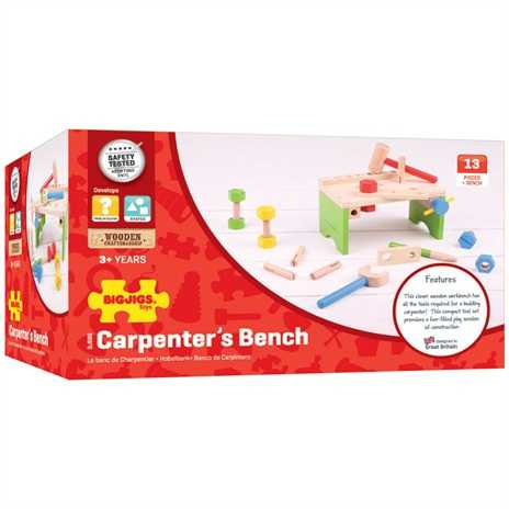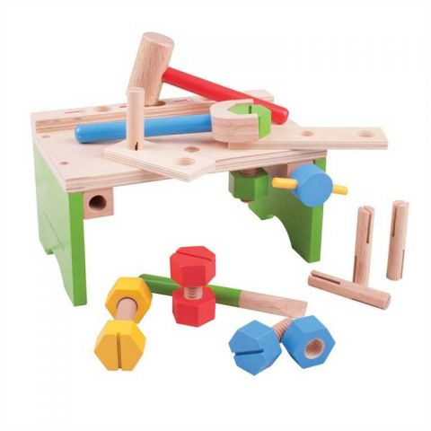 Tento chytře navržený dřevěný tesařský ponk obsahuje dřevěný klíč, kladivo a spoustu šroubů, matic a zatloukacích špalíků.
