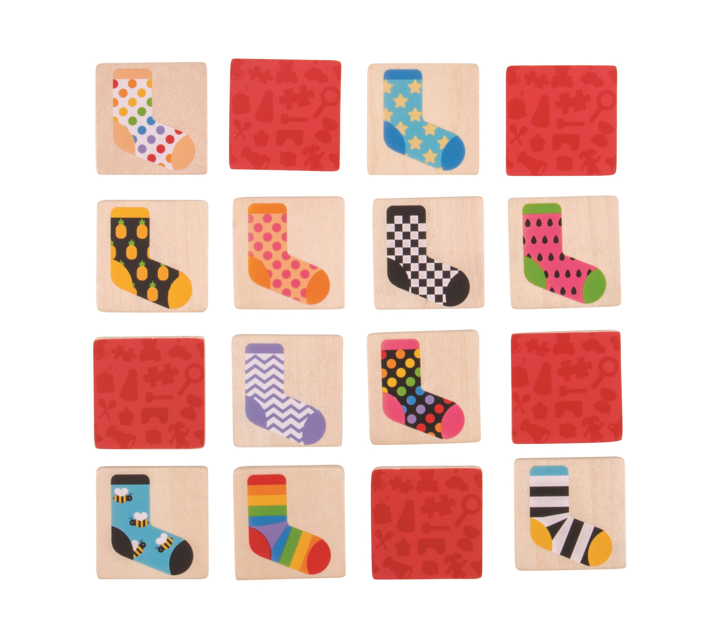 Tato hra s ponožkami určitě otestuje paměť a pozorovací schopnosti dětí! 32 dřevěných dílků je umístěno lícem dolů na stůl nebo podlahu. Hráči se musí střídat a otáčí vždy dva dílky. Pokud se shodují, hráč si ponechá tento pár ponožek a otočí další dvě, přičemž pokračuje, dokud se obě otočené destičky neshodují – pak je na řadě další hráč. Hráč s největším počtem párů na konci hry je vítěz! Tím zábava nekončí... Skvělý způsob, jak rozvíjet koncentraci, paměť a pozorovací schopnosti. Podporuje interaktivní hry a rozvíjí slovní zásobu. Učí děti obratu a strategii. Vyrobeno z vysoce kvalitních, zodpovědně získaných materiálů. Splňuje aktuální evropské bezpečnostní normy. Skládá se z 32 hracích dílků.