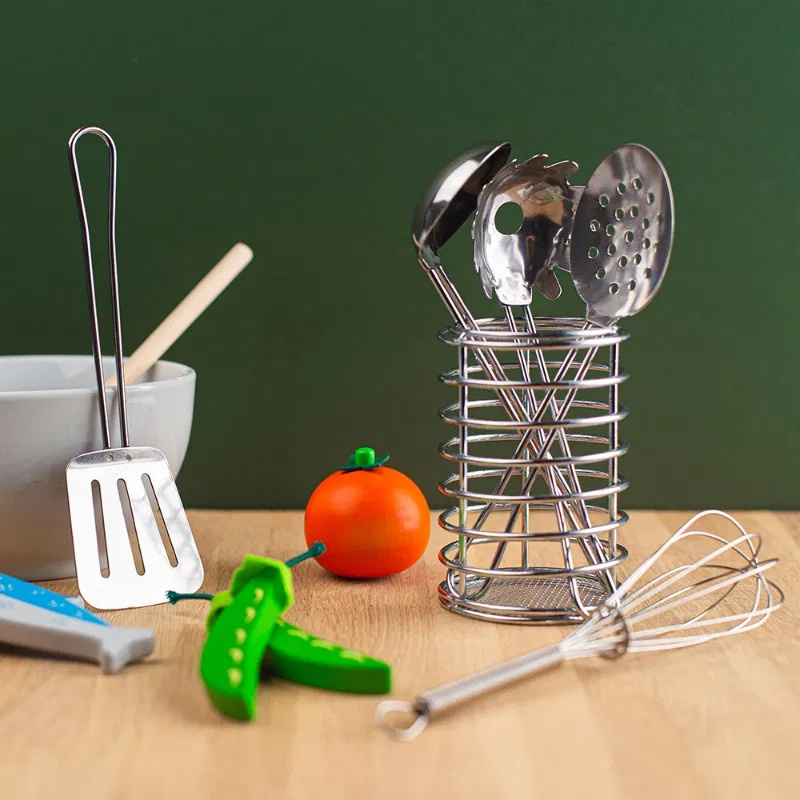 Za pomoci sady kuchyňského náčiní bude vaření a pečení hračkou! Sada určená pro malé kuchaře a kuchařky obsahuje šest náčiní pro děti včetně obracečky, děrované lžíce, naběračky, šlehací metly, naběračky na špagety a vařečky, uložené v praktické válcové nádobě. Děti mohou šlehat, míchat a servírovat a vyzkoušejí si různé kuchyňské činnosti a podpoří tak svou kreativitu. Hraní na role je skvělý způsob, jak rozvíjet sociální inteligenci, jazykové schopnosti, kreativní myšlení a komunikační dovednosti. Manipulace s kuchyňským náčiním zlepšuje jemnou motoriku a koordinaci ruka-oko. Náčiní je vyrobeno z prvotřídních kvalitních materiálů z odpovědných zdrojů a nabarveno netoxickými barvami a laky. Splňuje aktuální evropské bezpečnostní normy.