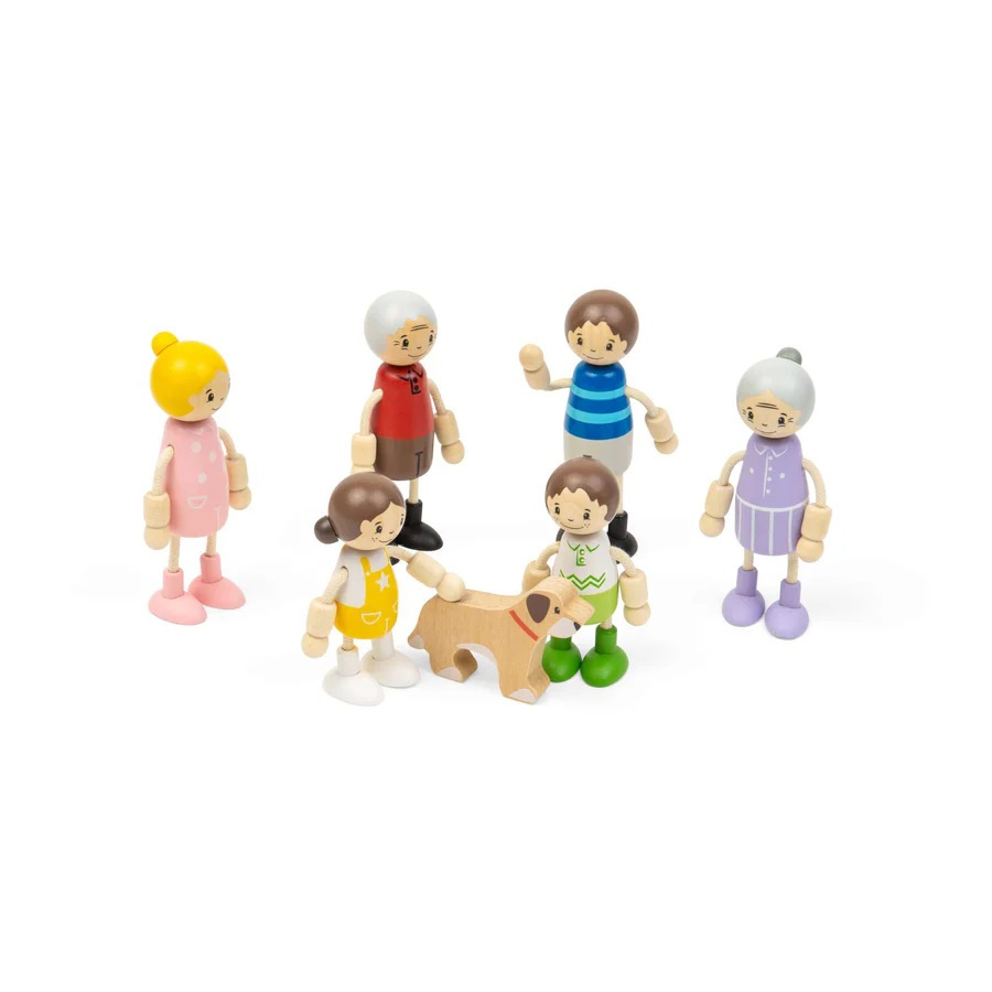 Dodejte domečku pro panenky život s touto roztomilou rodinnou sadou! Tato krásná kolekce dřevěných figurek představuje tři generace - prarodiče, rodiče, dvě děti a věrného rodinného psa. Panenky mají ideální velikost pro malé dětské ručičky, takže se s nimi snadno manipuluje při každodenních herních dobrodružstvích. Každá figurka má ohebné ruce a nohy, díky čemuž může sedět, ležet nebo stát a zapojit se do různých situací v domečku. Vyrobeno z kvalitního FSC® certifikovaného dřeva, které zaručuje odolnost i šetrnost k životnímu prostředí. Díky milým obličejům a barevnému oblečení jsou panenky připravené zabydlet se v jakémkoli domečku pro panenky. Hra s figurkami podporuje rozvoj fantazie, sociálních dovedností i emočního vnímání. Děti si mohou přehrávat každodenní situace, čímž si přirozeně osvojují vztahy a komunikaci. Manipulace s panenkami zároveň rozvíjí jemnou motoriku a koordinaci ruka–oko.