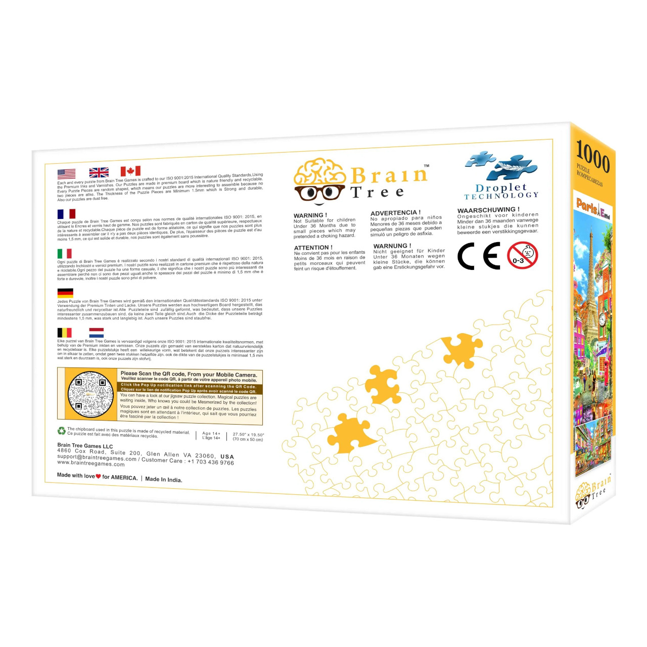 V každém balení naleznete plakát s odpovídajícím obrázkem vytištěným ve stejné kvalitě jako samotné puzzle. Součástí je také několik praktických skládacích kartónových přihrádek, které můžete využít při třídění dílků. Užitečným doplňkem dodávaným spolu se skládačkami je papírový stojan, do kterého můžete usadit víko krabice, abyste mohli při stavbě pohodlně nahlížet na vzorový obrázek. V sadách o 1000 dílcích navíc dostanete i velký a odolný uzavíratelný sáček, který dílky puzzle spolehlivě ochrání před poškozením a ztrátou.