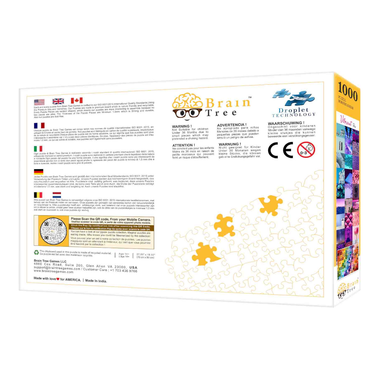V každém balení naleznete plakát s odpovídajícím obrázkem vytištěným ve stejné kvalitě jako samotné puzzle. Součástí je také několik praktických skládacích kartónových přihrádek, které můžete využít při třídění dílků. Užitečným doplňkem dodávaným spolu se skládačkami je papírový stojan, do kterého můžete usadit víko krabice, abyste mohli při stavbě pohodlně nahlížet na vzorový obrázek. V sadách o 1000 dílcích navíc dostanete i velký a odolný uzavíratelný sáček, který dílky puzzle spolehlivě ochrání před poškozením a ztrátou.