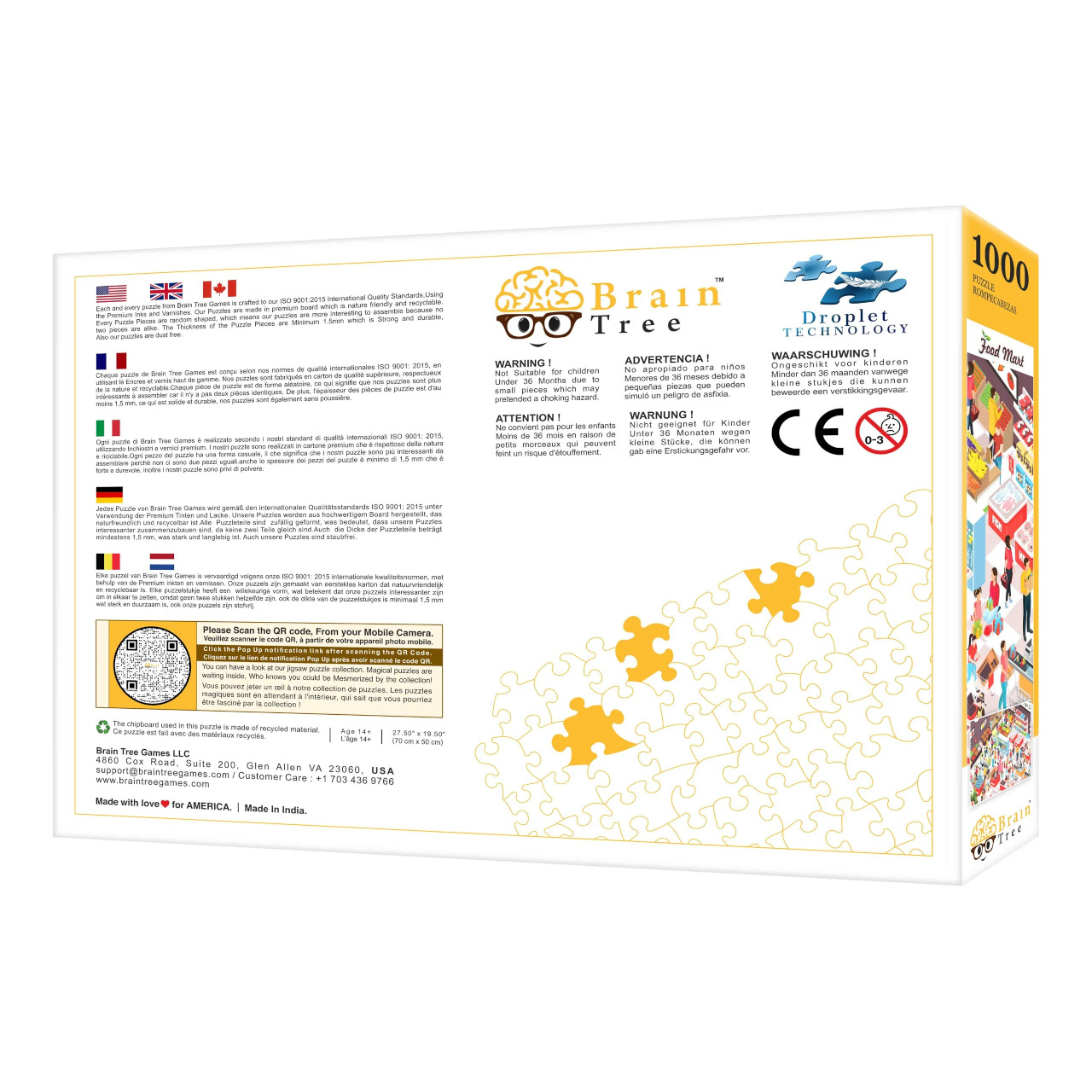 V každém balení naleznete plakát s odpovídajícím obrázkem vytištěným ve stejné kvalitě jako samotné puzzle. Součástí je také několik praktických skládacích kartónových přihrádek, které můžete využít při třídění dílků. Užitečným doplňkem dodávaným spolu se skládačkami je papírový stojan, do kterého můžete usadit víko krabice, abyste mohli při stavbě pohodlně nahlížet na vzorový obrázek. V sadách o 1000 dílcích navíc dostanete i velký a odolný uzavíratelný sáček, který dílky puzzle spolehlivě ochrání před poškozením a ztrátou.