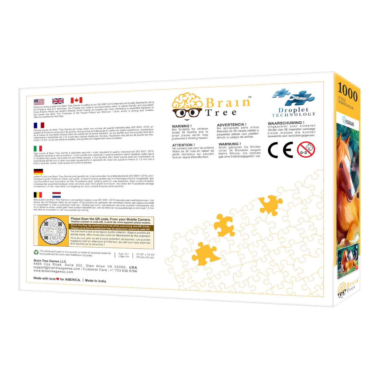 V každém balení naleznete plakát s odpovídajícím obrázkem vytištěným ve stejné kvalitě jako samotné puzzle. Součástí je také několik praktických skládacích kartónových přihrádek, které můžete využít při třídění dílků. Užitečným doplňkem dodávaným spolu se skládačkami je papírový stojan, do kterého můžete usadit víko krabice, abyste mohli při stavbě pohodlně nahlížet na vzorový obrázek. V sadách o 1000 dílcích navíc dostanete i velký a odolný uzavíratelný sáček, který dílky puzzle spolehlivě ochrání před poškozením a ztrátou.