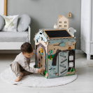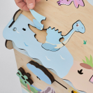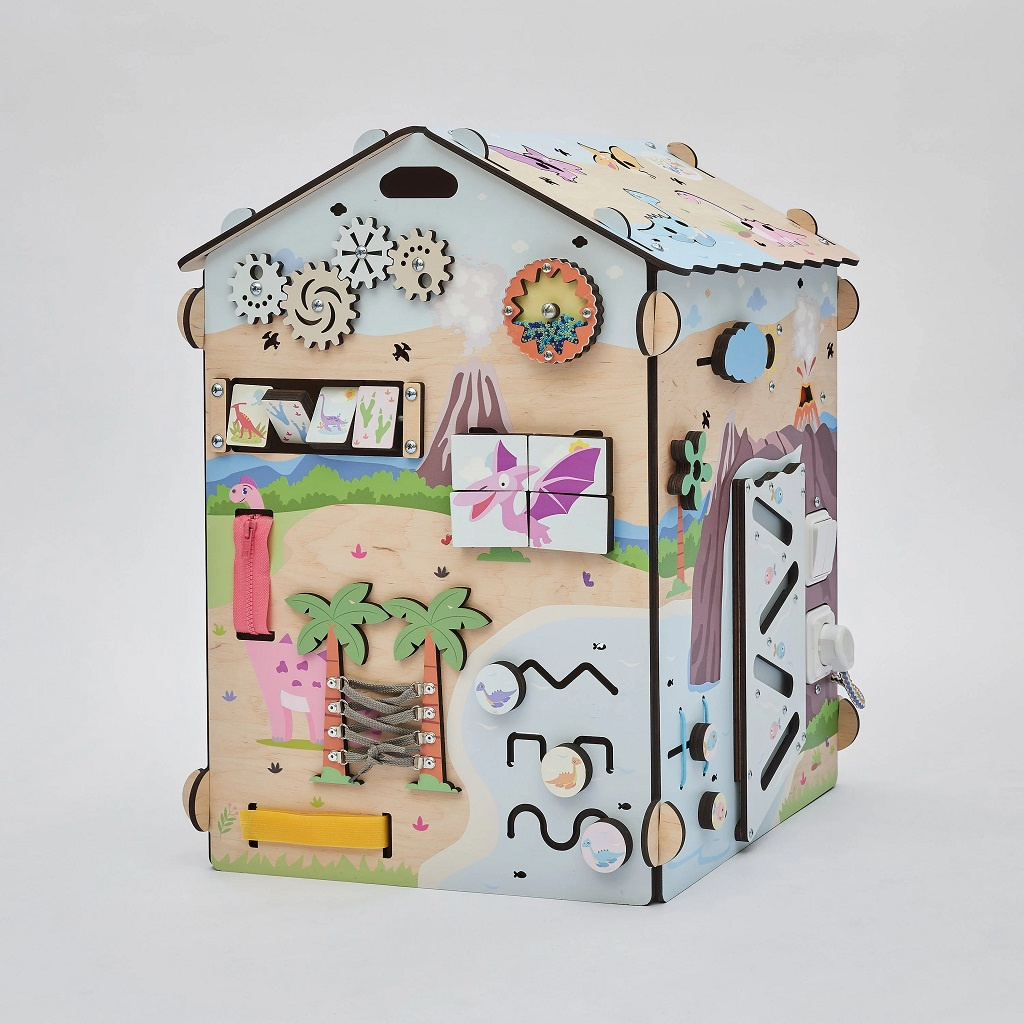 Activity board domeček nabízí šest samostatných aktivit, které lze používat jednotlivě nebo dohromady. Některé prvky lze rozsvítit, například sopku a slunce, čímž vzniká podmanivá herní atmosféra. Domeček zahrnuje přibližně 30 herních prvků a lze ho využít jako úkryt, domeček pro panenky či garáž pro autíčka. Na střeše najdete tabuli a vkládací puzzle s dinosaury. Díky interaktivním prvkům domeček podporuje rozvoj kreativity, smyslového vnímání, logického myšlení a jemné motoriky. Děti si trénují koordinaci oko–ruka, soustředění a trpělivost při složitějších aktivitách.