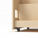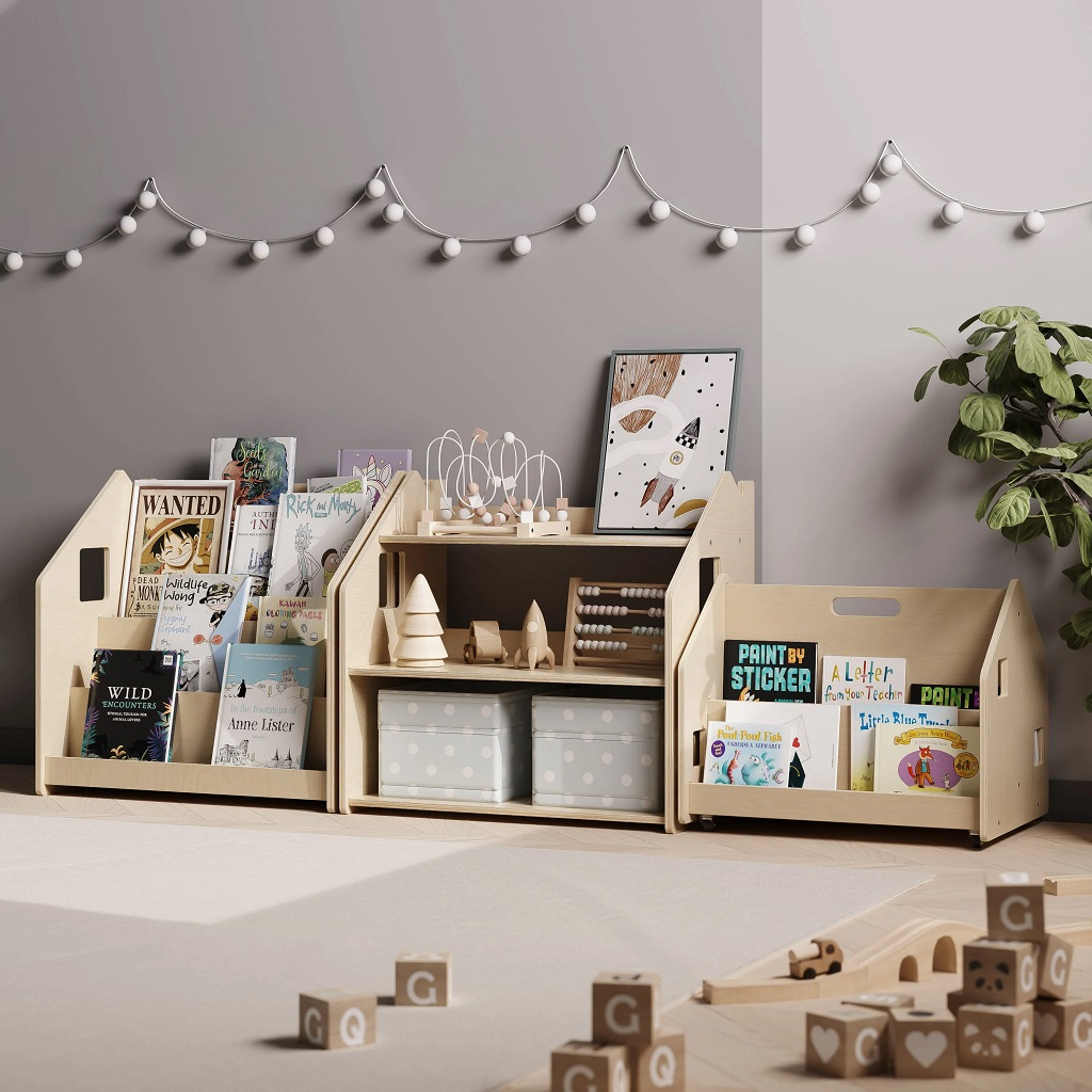 Oboustranná knihovna na kolečkách je praktické a bezpečné řešení do dětského pokoje. Knihy jsou v ní uložené tak, aby děti viděly jejich obálky a mohly si samostatně vybrat to, co je zaujme. Podporuje tak nezávislost i přirozenou lásku ke čtení. Díky kolečkům lze knihovnu snadno přesunout tam, kde je zrovna potřeba. Její design je ekologický, bezpečný a maximálně přátelský k dětem.