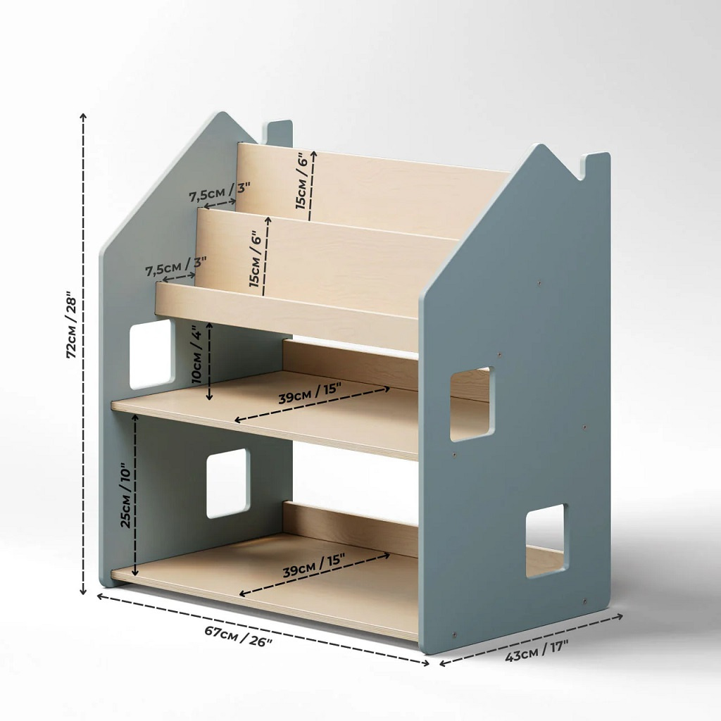 Tato police na hračky a knihy je navržena tak, aby podporovala dětskou samostatnost i pořádek. Díky přehlednému uspořádání si děti mohou samy vybírat a ukládat knihy i hračky, přičemž obálky knih jsou krásně viditelné a lákají ke čtení. Police nabízí čtyři prostorné regály a zadní úložný prostor vhodný pro knihy či hračky. Robustní a bezpečná konstrukce s pečlivě zaoblenými hranami je ošetřena lakem na vodní bázi. Díky jednoduchému, čistému designu krásně zapadne do každého interiéru. Součástí balení je samotná police, přehledný montážní návod i potřebné nářadí. Police je vyrobena z kvalitní lakované březové překližky a její stabilní konstrukce s hladce zaoblenými hranami zajišťuje maximální bezpečnost.